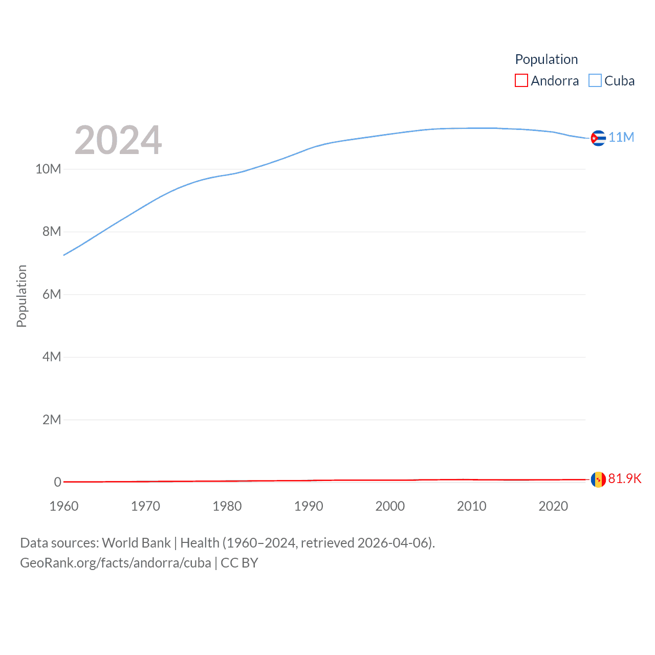 Andorra has a population of 81.9K (ranked 186/197), compared with 11M in Cuba (ranked 87/197). Andorra's land area is 181.5 sq mi versus 40,077 sq mi for Cuba (ranked 179th vs. 103rd).