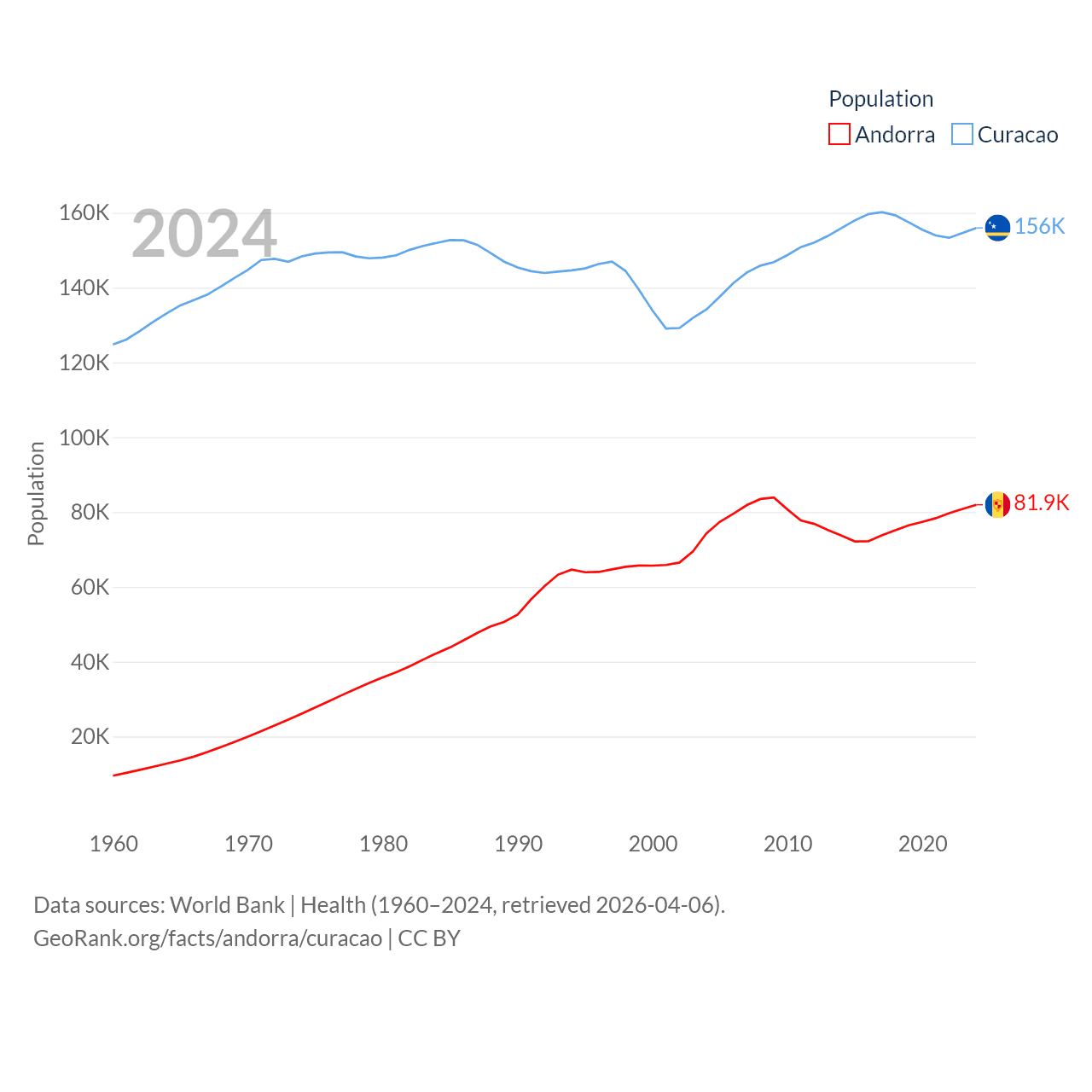 Andorra has a population of 81.9K (ranked 186/197), compared with 156K in Curacao (ranked 179/197). Andorra's land area is 181.5 sq mi versus 171.4 sq mi for Curacao (ranked 179th vs. 182nd).