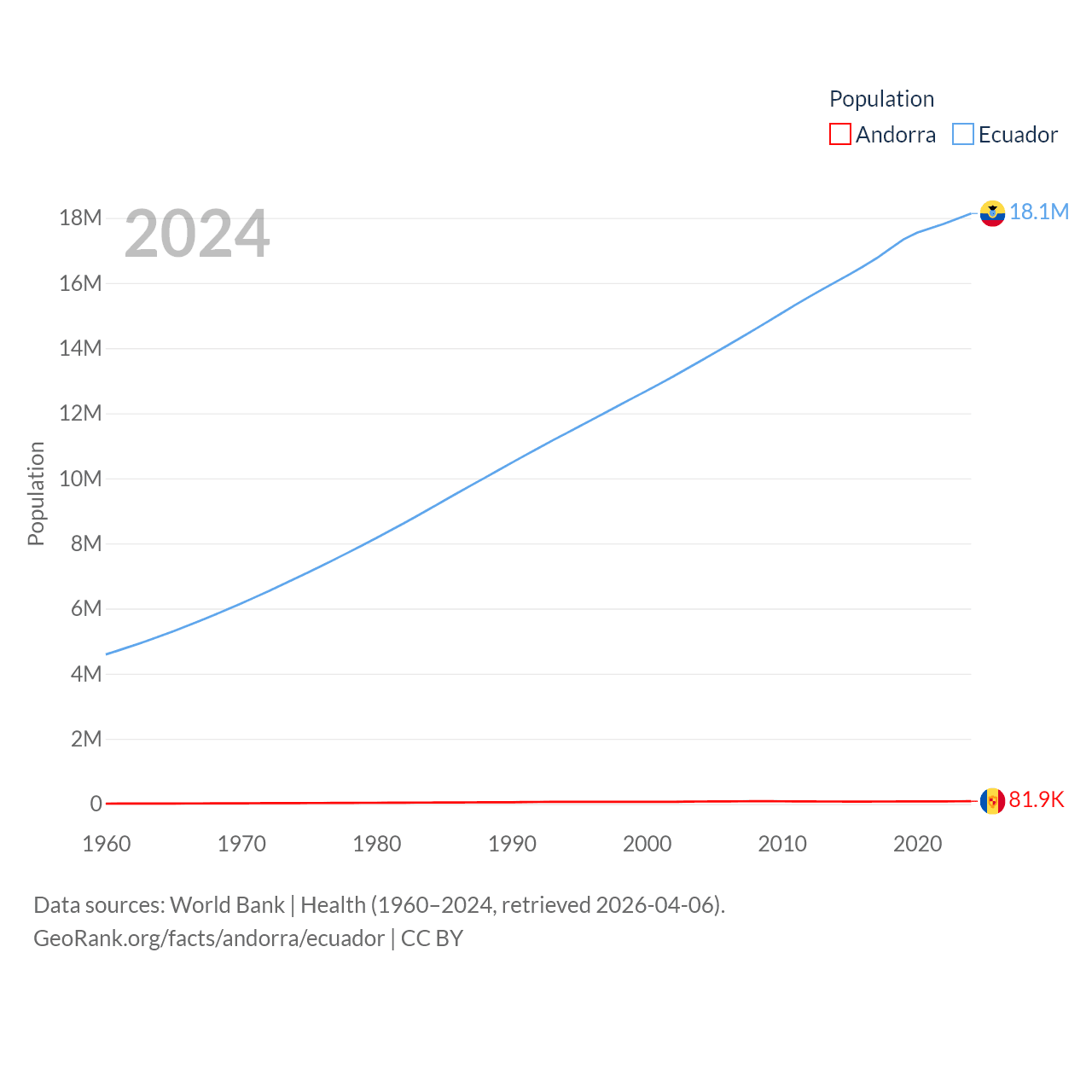 Andorra has a population of 81.9K (ranked 186/197), compared with 18.1M in Ecuador (ranked 71/197). Andorra's land area is 181.5 sq mi versus 95,892 sq mi for Ecuador (ranked 179th vs. 76th).