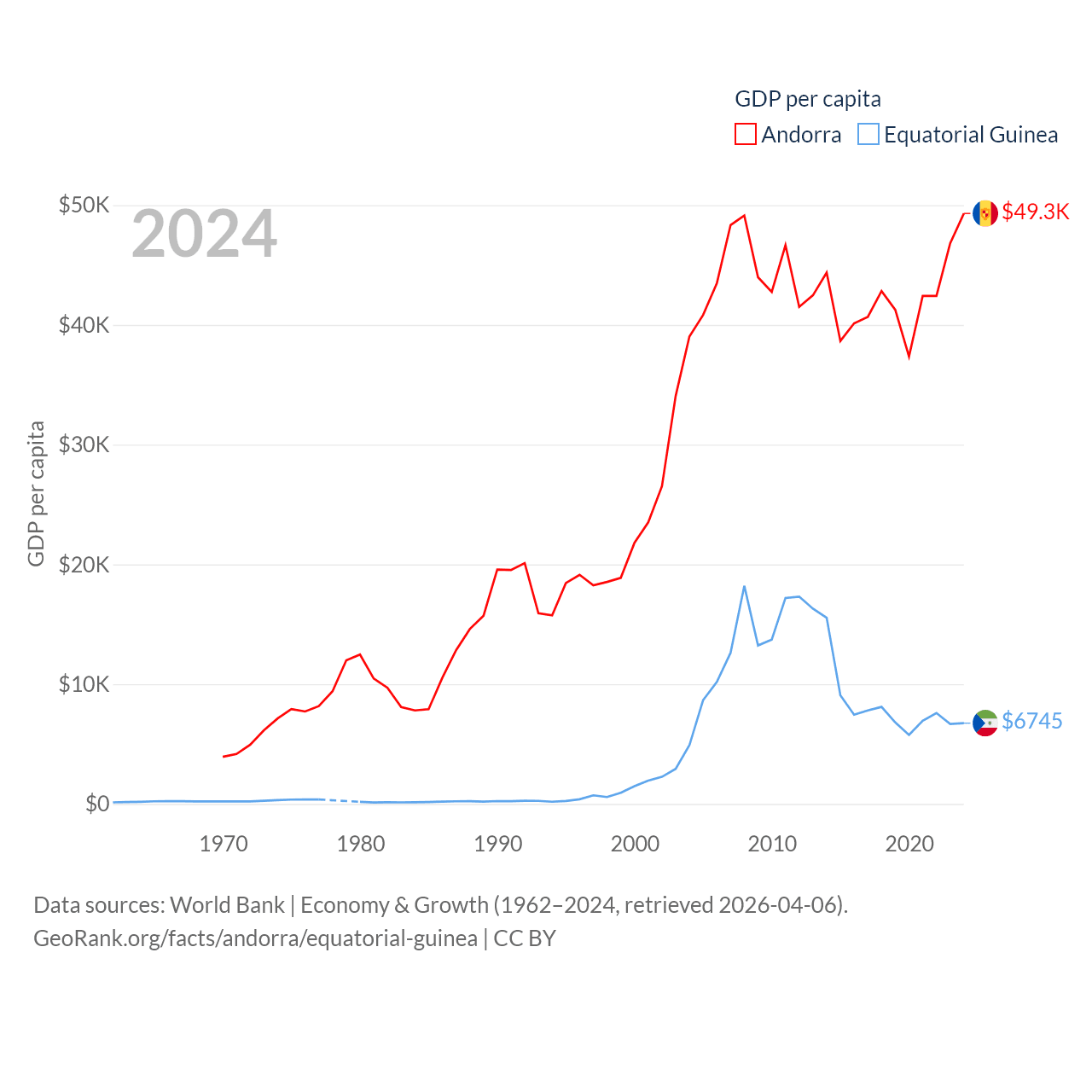 By GDP, Andorra ranks 166/197 ($4.04B) and Equatorial Guinea ranks 148/197 ($12.8B). By GDP per capita, Andorra ranks 25/197 ($49,304), while Equatorial Guinea ranks 106/197 ($6,745).