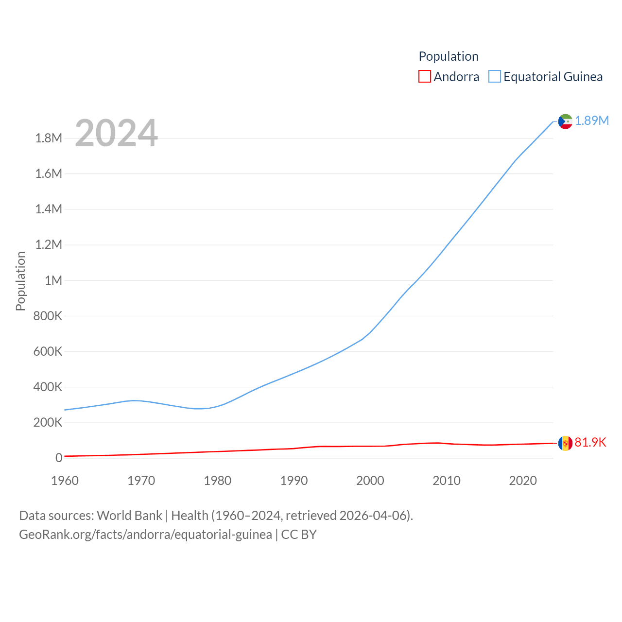 Andorra has a population of 81.9K (ranked 186/197), compared with 1.89M in Equatorial Guinea (ranked 148/197). Andorra's land area is 181.5 sq mi versus 10,830 sq mi for Equatorial Guinea (ranked 179th vs. 140th).