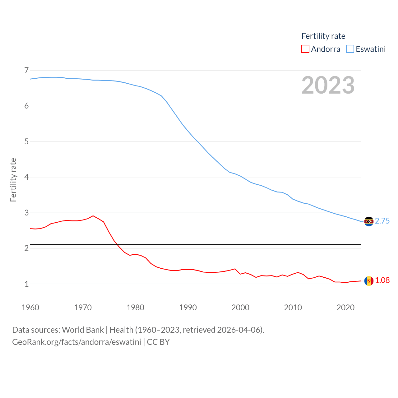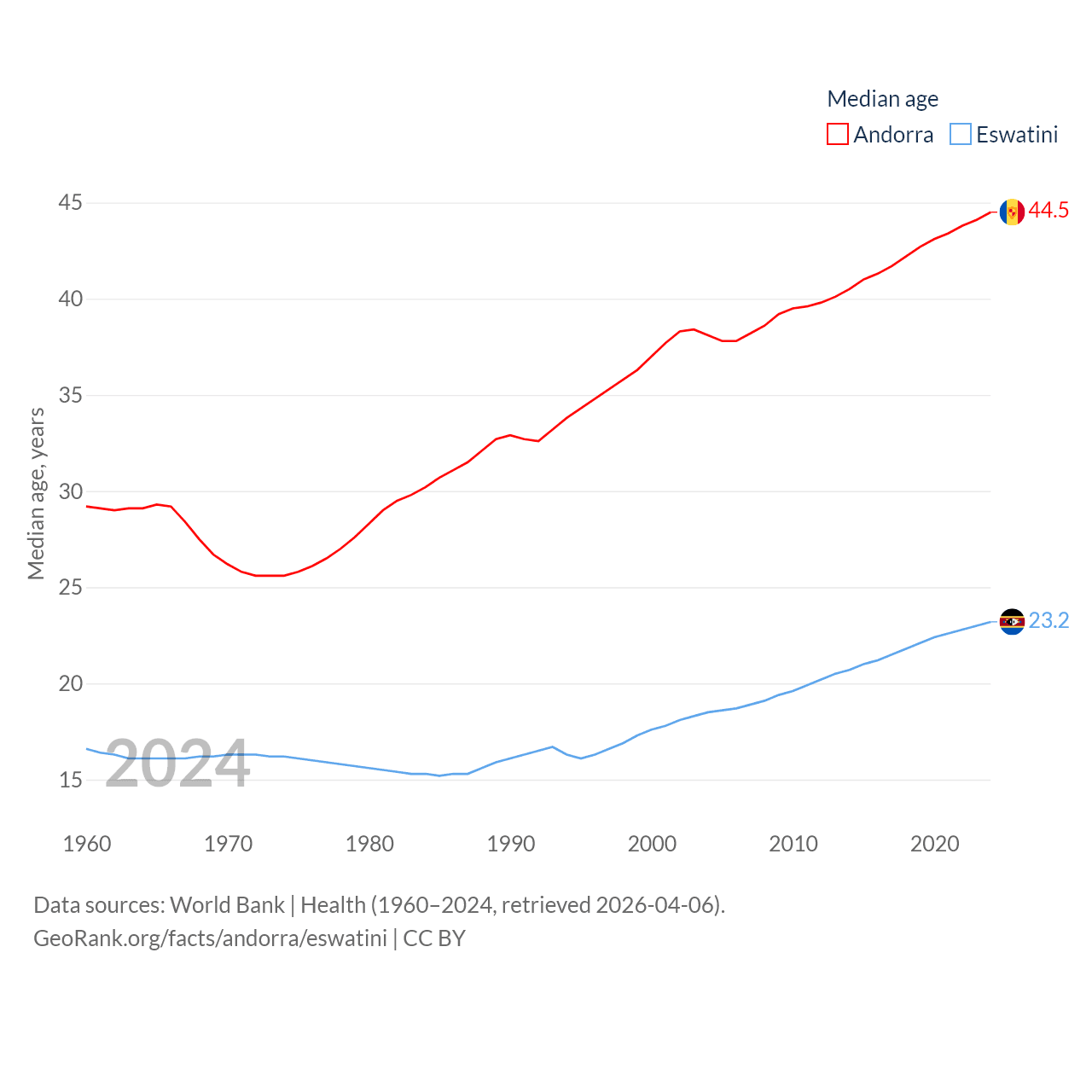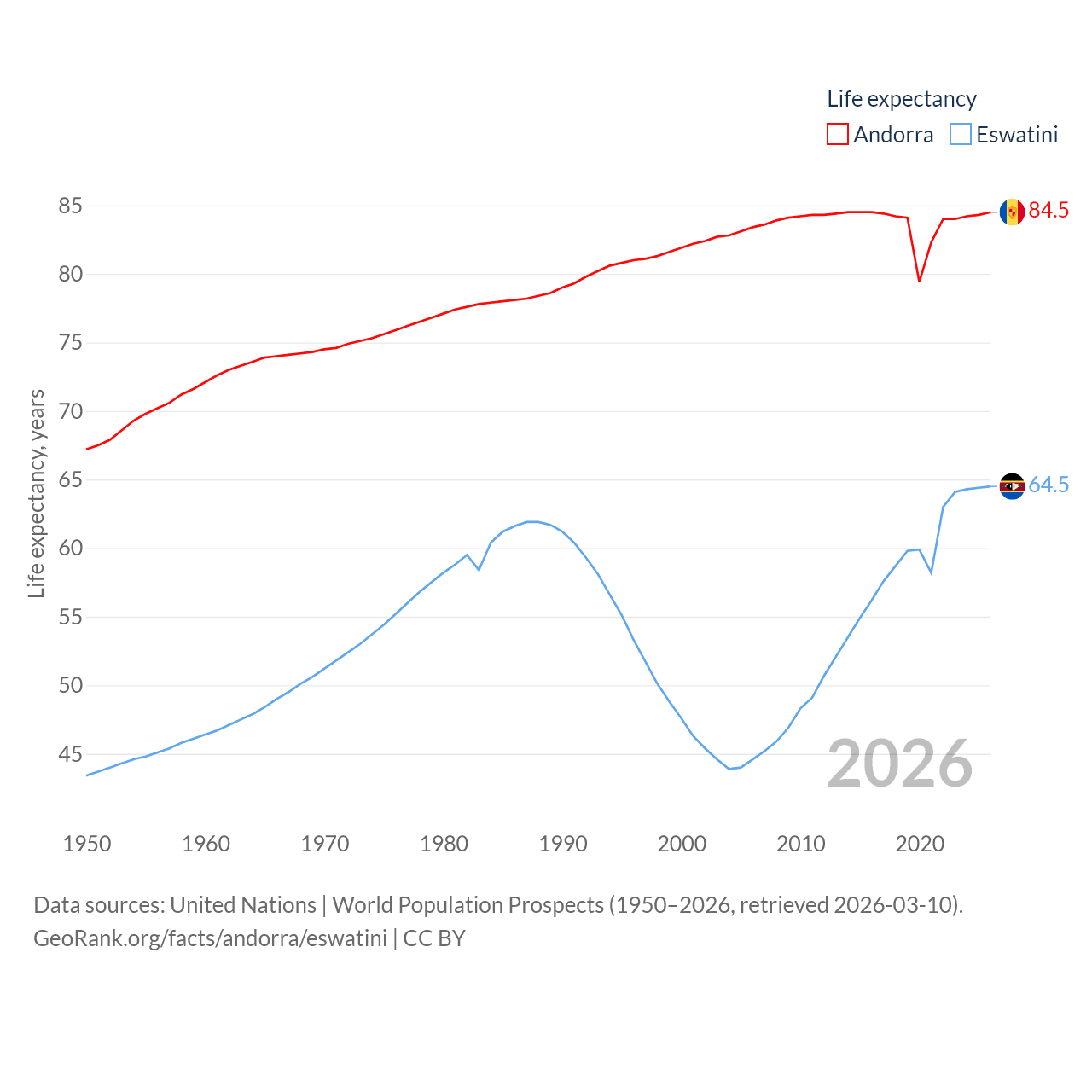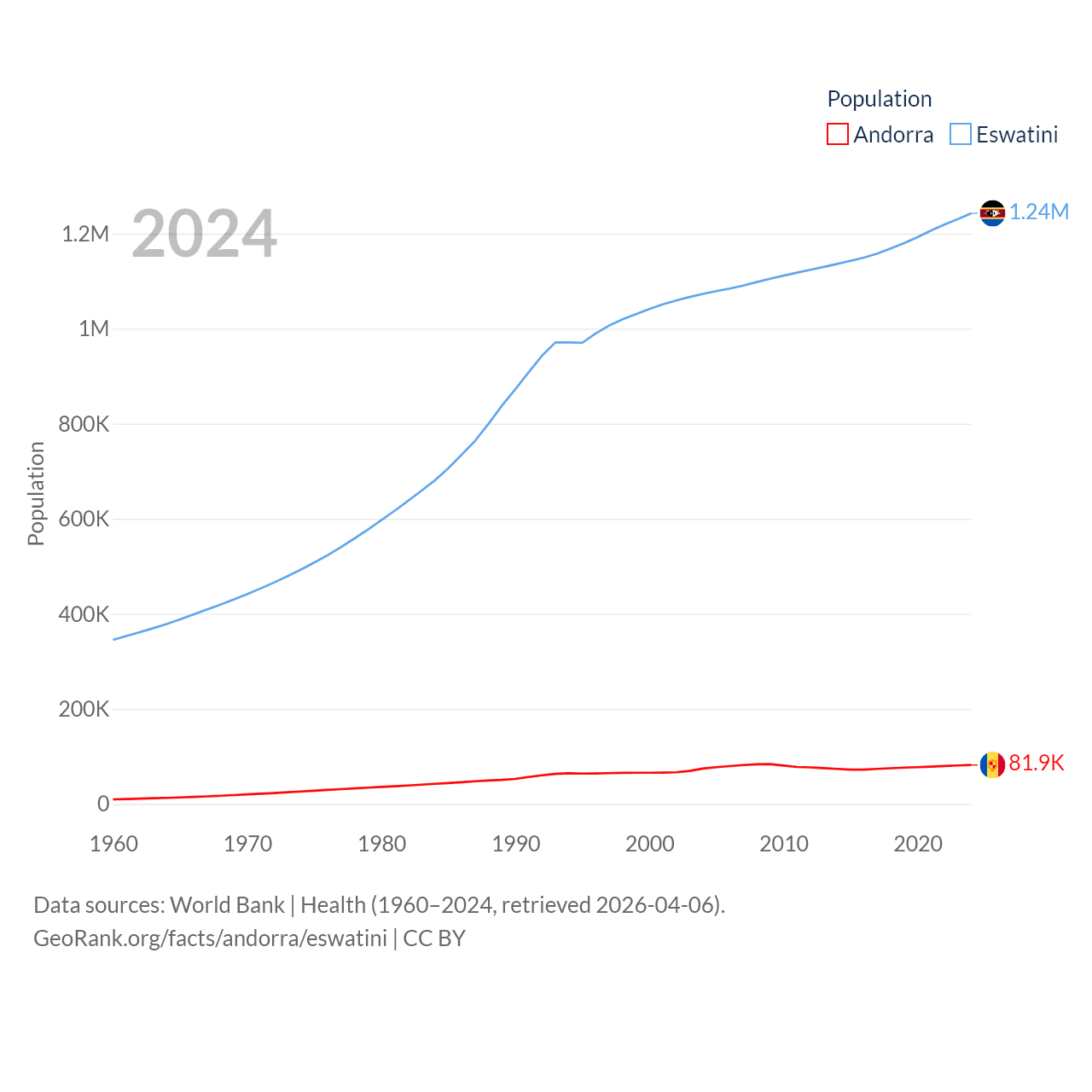 Andorra has a population of 81.9K (ranked 186/197), compared with 1.24M in Eswatini (ranked 157/197). Andorra's land area is 181.5 sq mi versus 6,641 sq mi for Eswatini (ranked 179th vs. 154th).