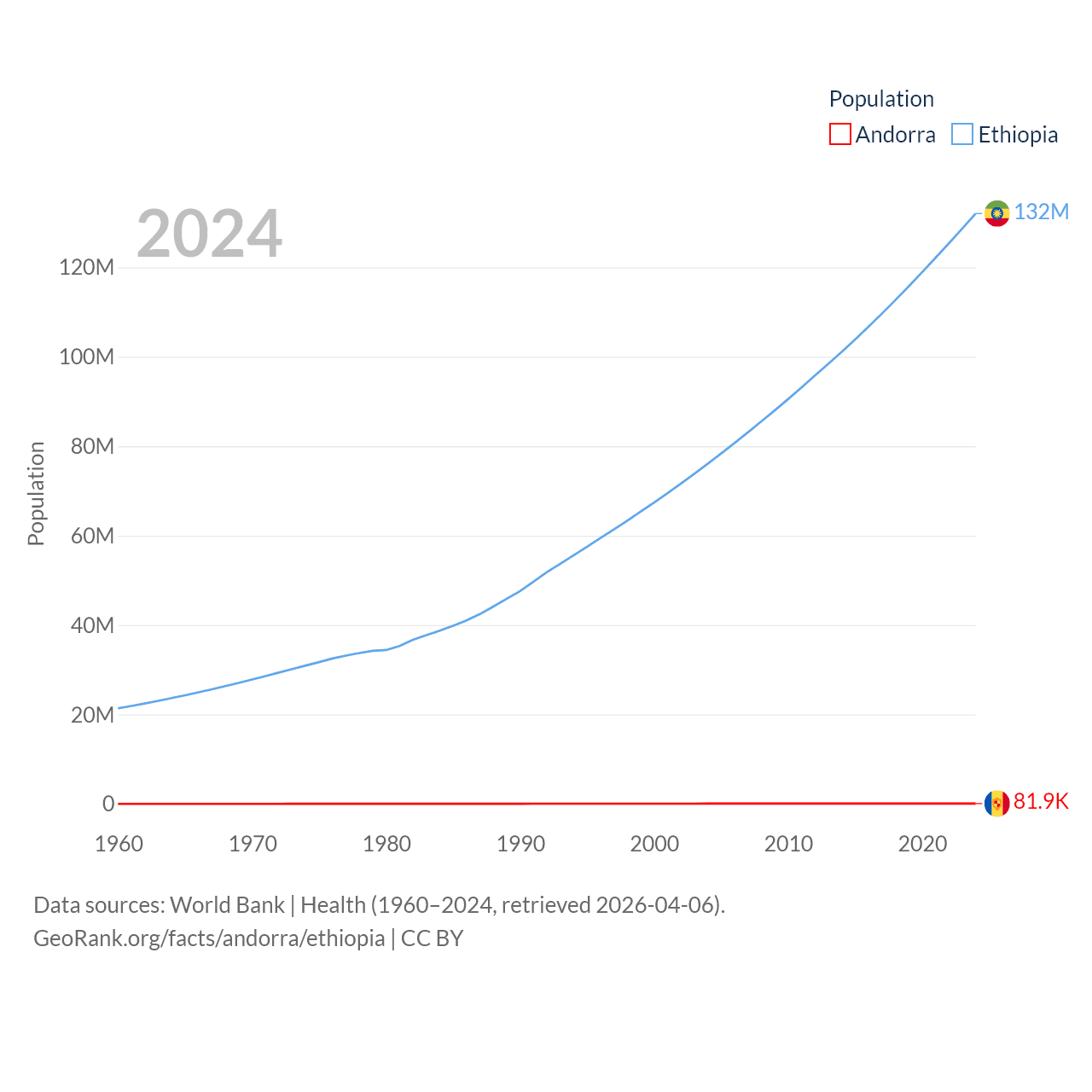 Andorra has a population of 81.9K (ranked 186/197), compared with 132M in Ethiopia (ranked 10/197). Andorra's land area is 181.5 sq mi versus 435,716 sq mi for Ethiopia (ranked 179th vs. 25th).