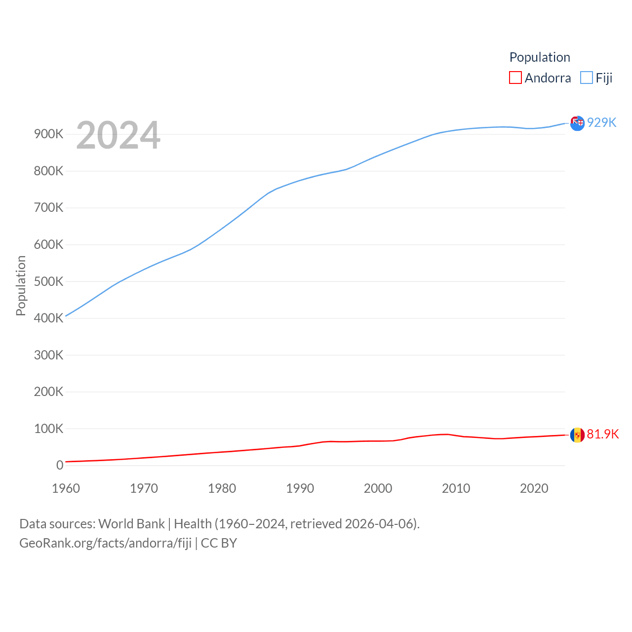 Andorra has a population of 81.9K (ranked 186/197), compared with 929K in Fiji (ranked 159/197). Andorra's land area is 181.5 sq mi versus 7,054 sq mi for Fiji (ranked 179th vs. 152nd).