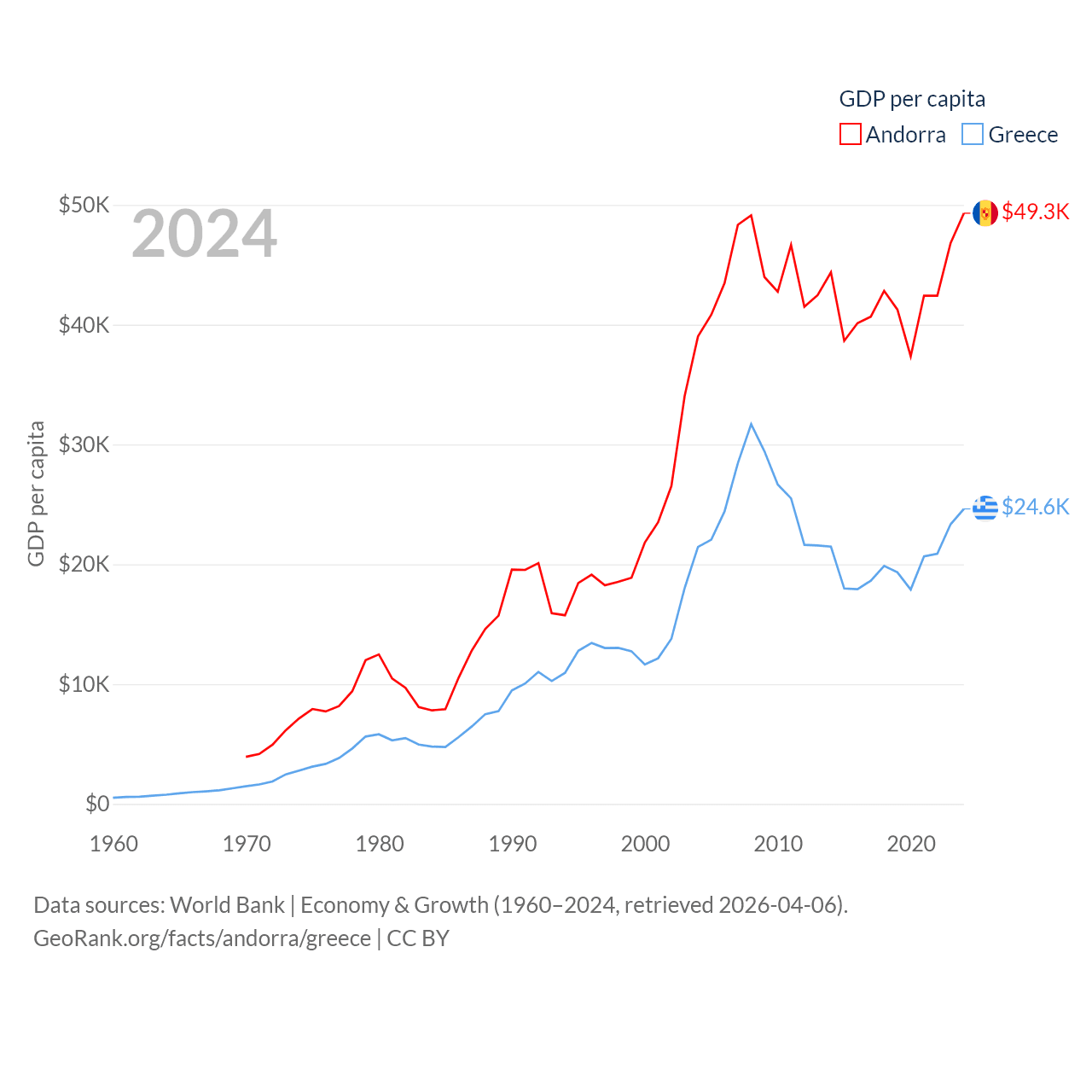 By GDP, Andorra ranks 166/197 ($4.04B) and Greece ranks 53/197 ($256B). By GDP per capita, Andorra ranks 25/197 ($49,304), while Greece ranks 49/197 ($24,626).
