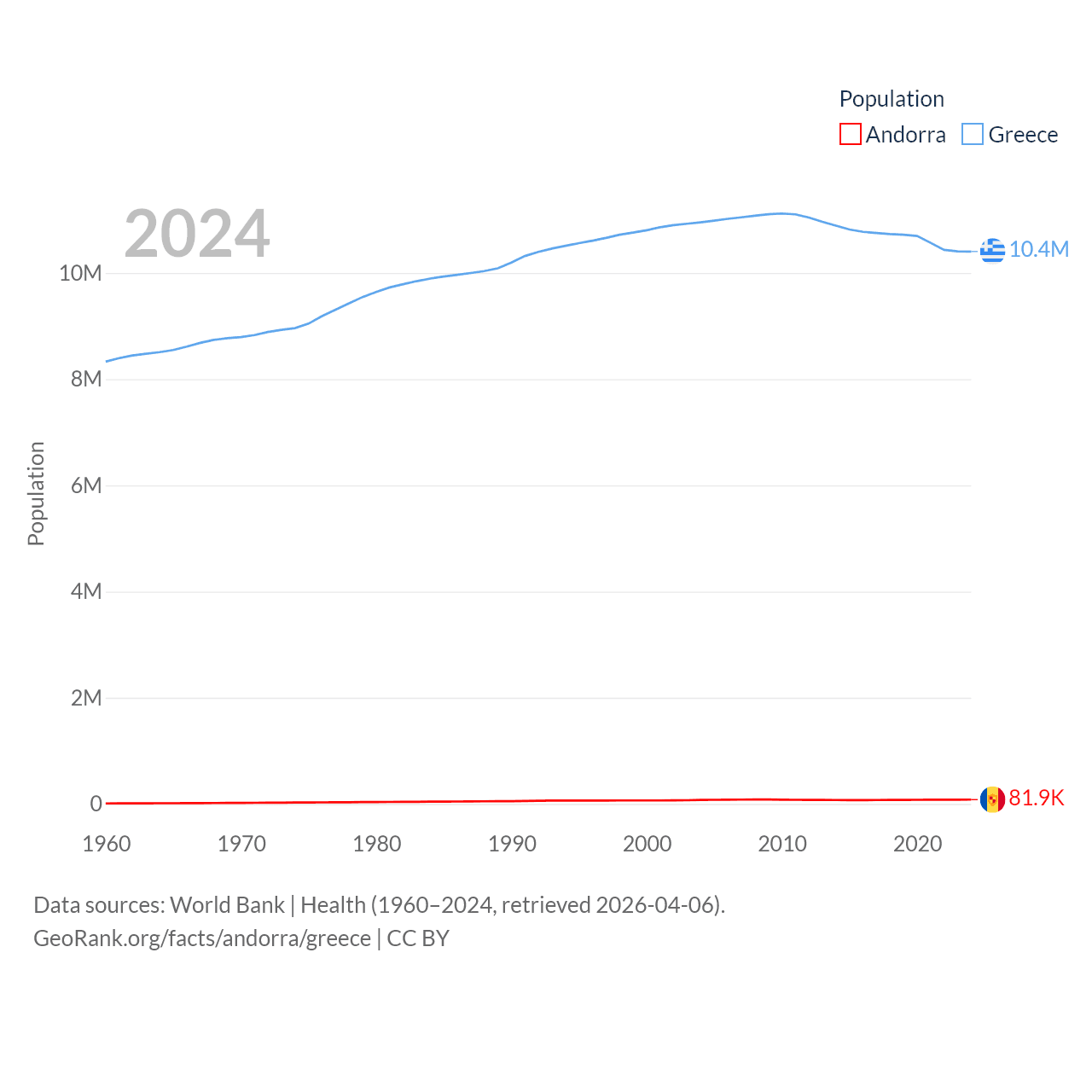 Andorra has a population of 81.9K (ranked 186/197), compared with 10.4M in Greece (ranked 94/197). Andorra's land area is 181.5 sq mi versus 49,769 sq mi for Greece (ranked 179th vs. 95th).