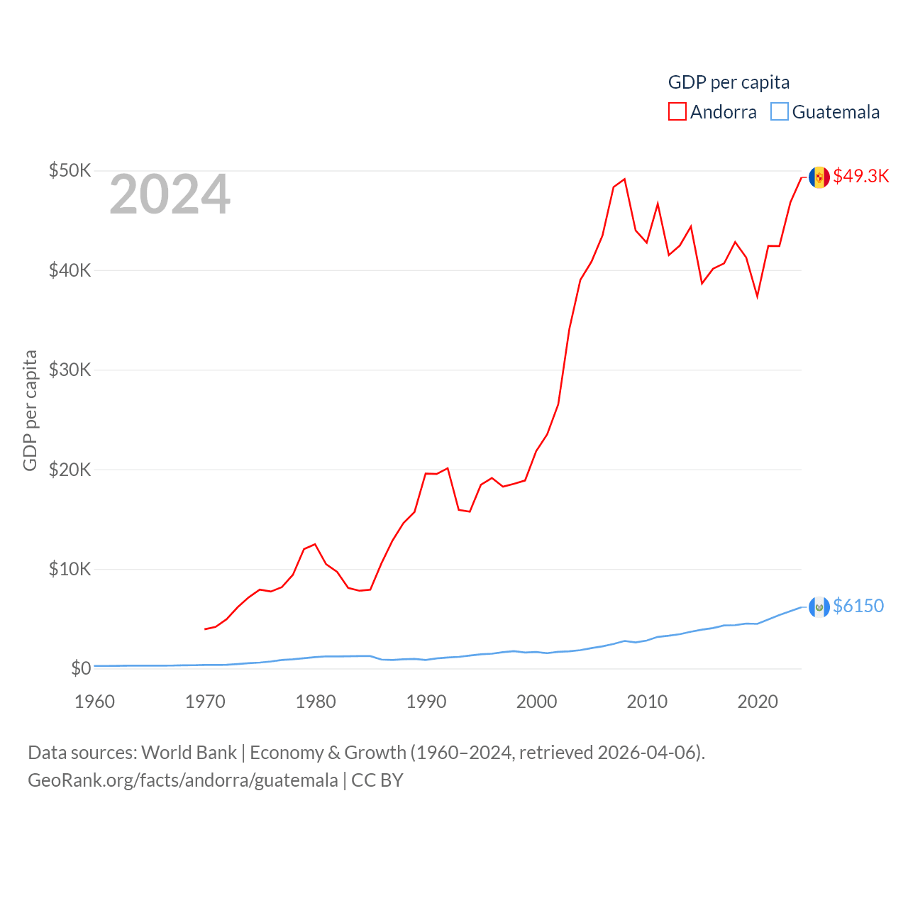 By GDP, Andorra ranks 166/197 ($4.04B) and Guatemala ranks 68/197 ($113B). By GDP per capita, Andorra ranks 25/197 ($49,304), while Guatemala ranks 112/197 ($6,150).