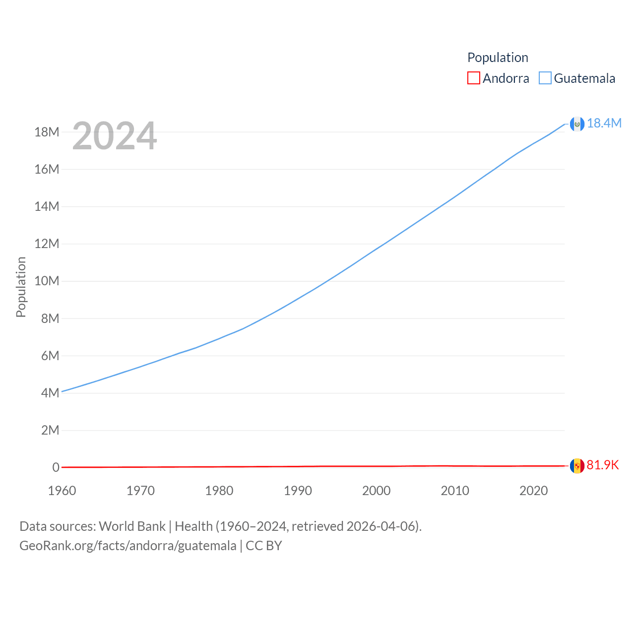Andorra has a population of 81.9K (ranked 186/197), compared with 18.4M in Guatemala (ranked 70/197). Andorra's land area is 181.5 sq mi versus 41,375 sq mi for Guatemala (ranked 179th vs. 102nd).