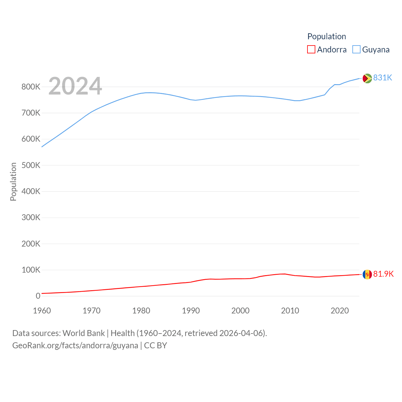 Andorra has a population of 81.9K (ranked 186/197), compared with 831K in Guyana (ranked 161/197). Andorra's land area is 181.5 sq mi versus 81,522 sq mi for Guyana (ranked 179th vs. 82nd).