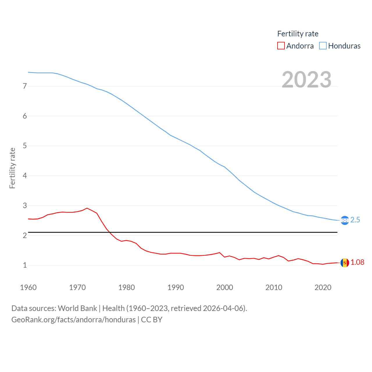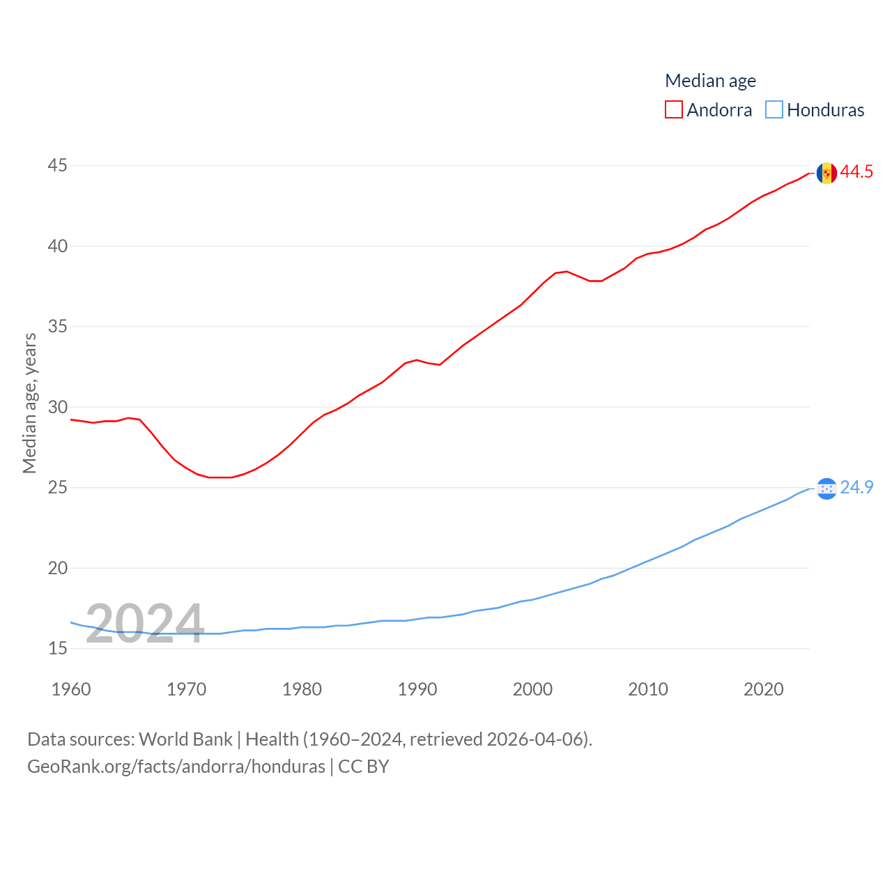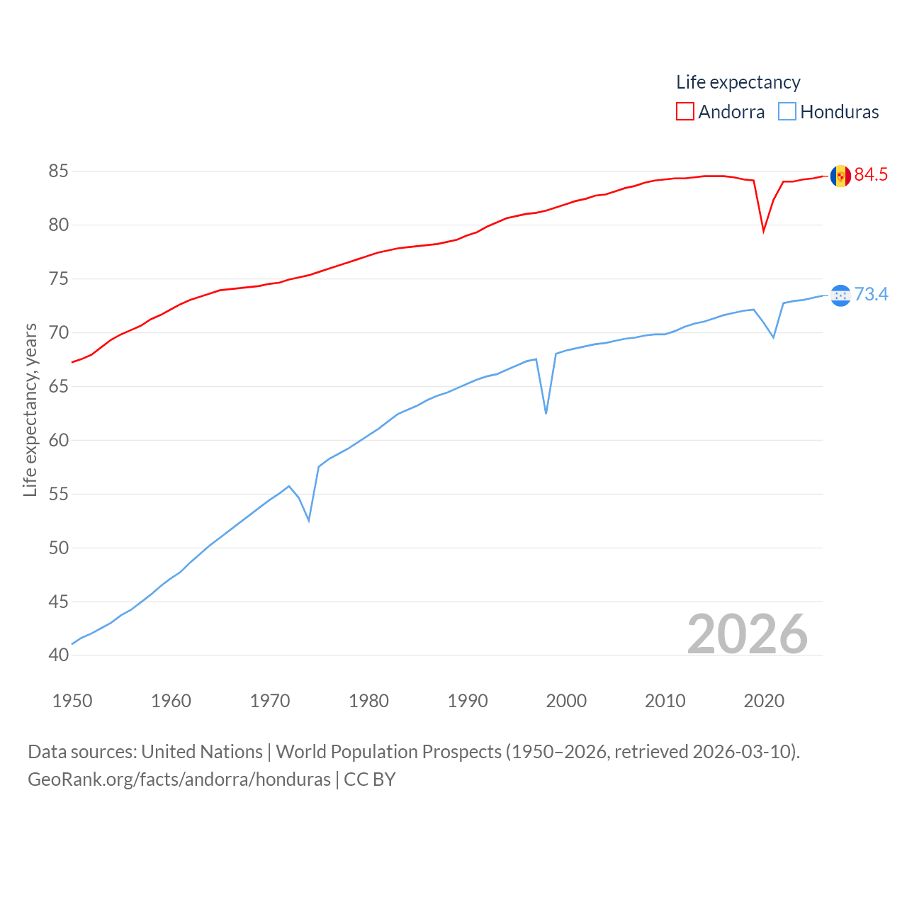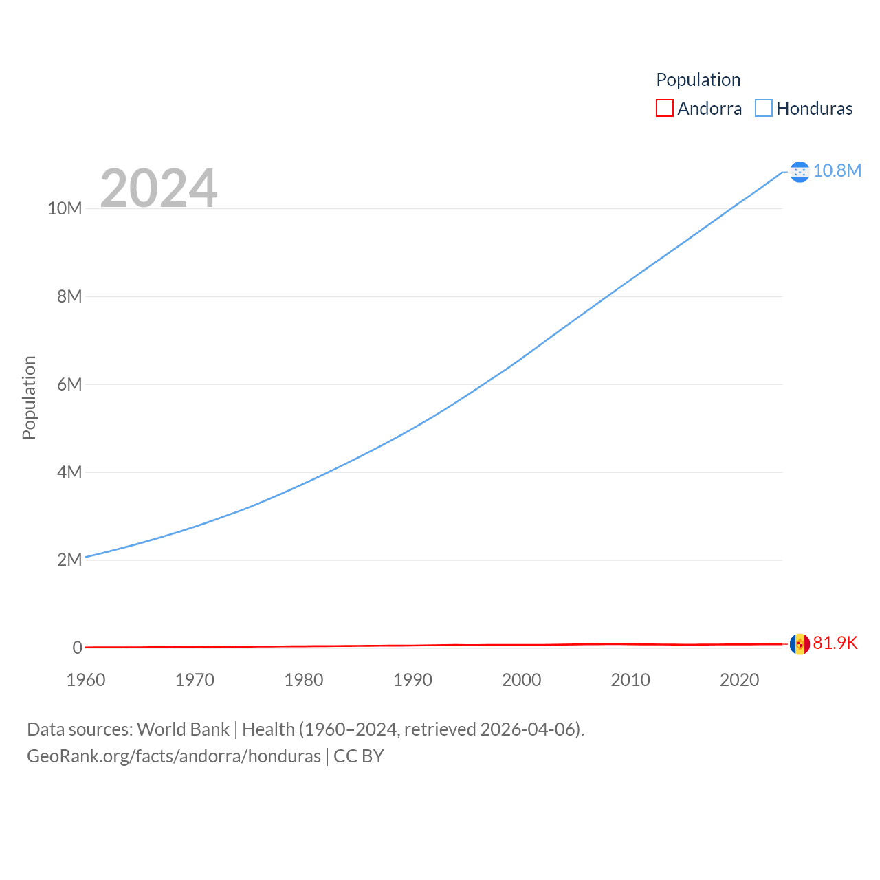 Andorra has a population of 81.9K (ranked 186/197), compared with 10.8M in Honduras (ranked 89/197). Andorra's land area is 181.5 sq mi versus 43,201 sq mi for Honduras (ranked 179th vs. 100th).