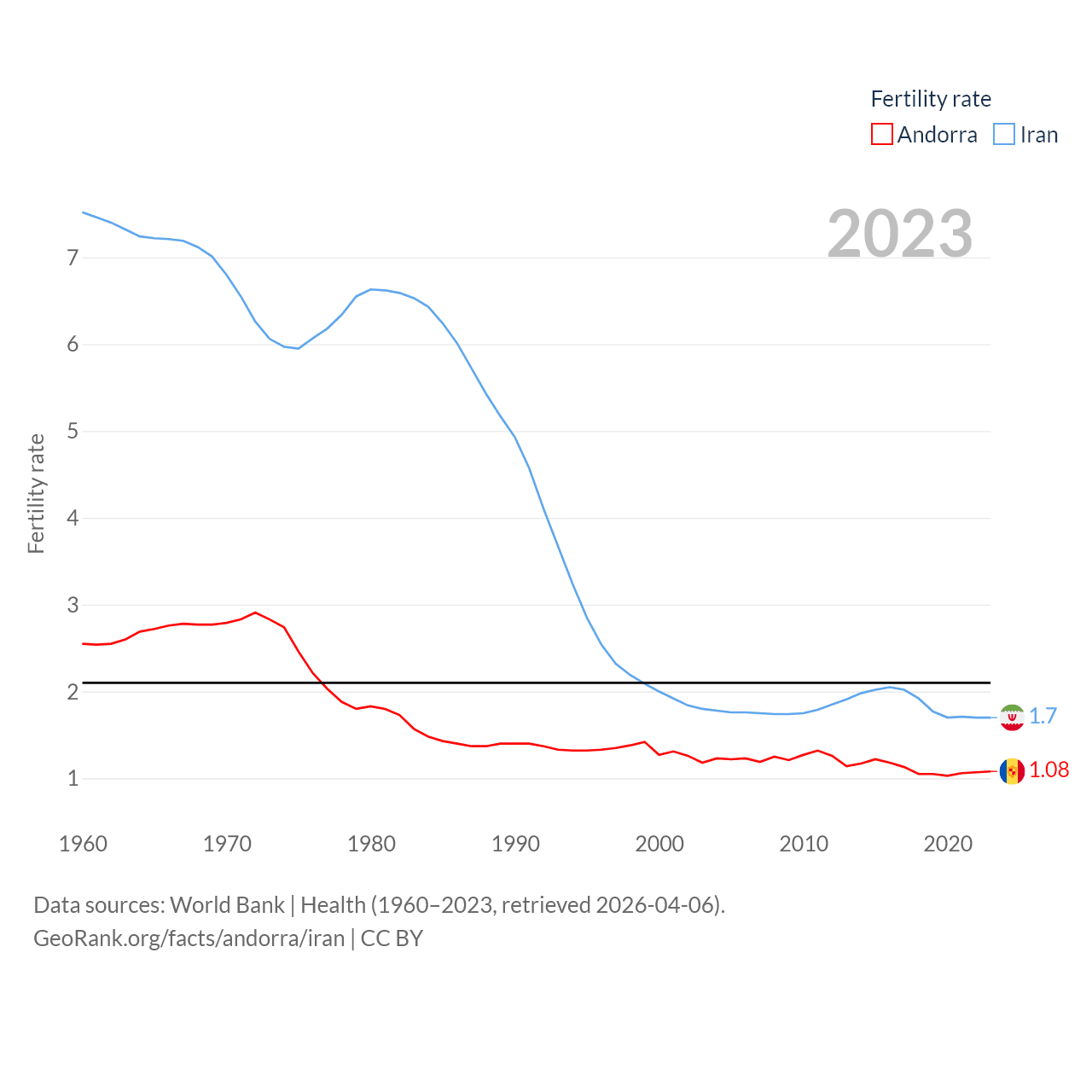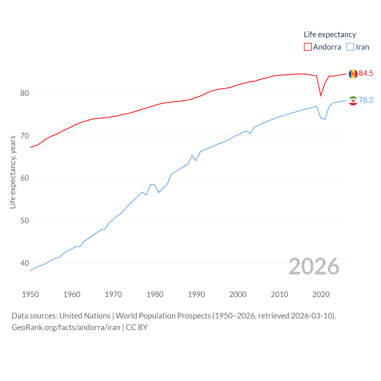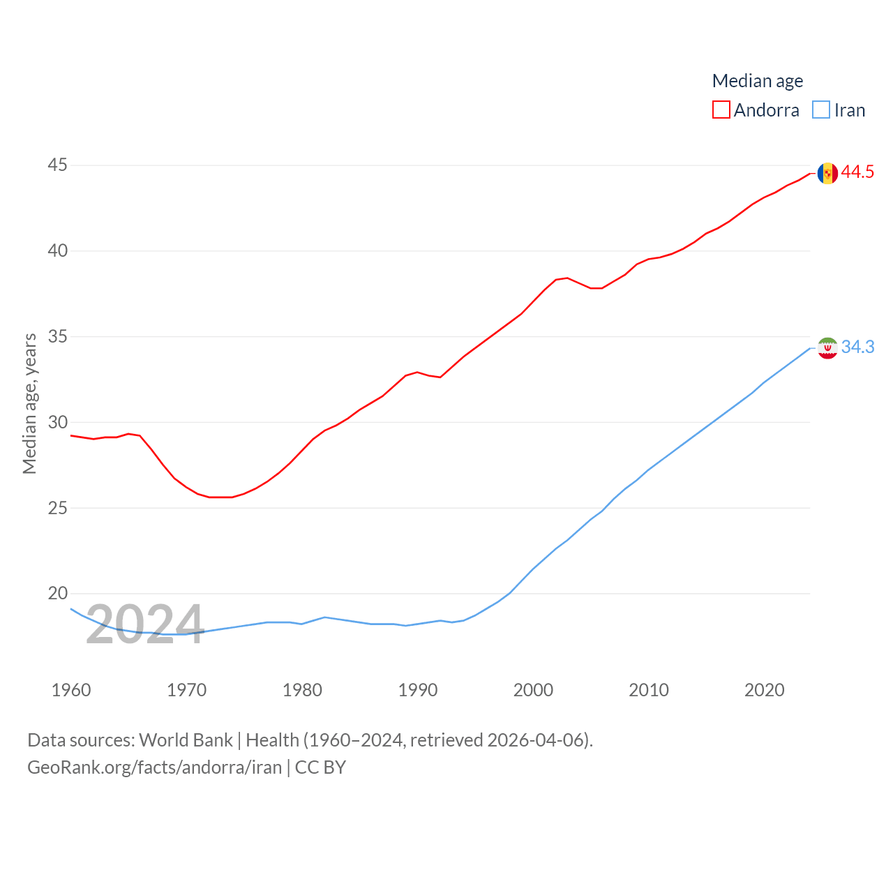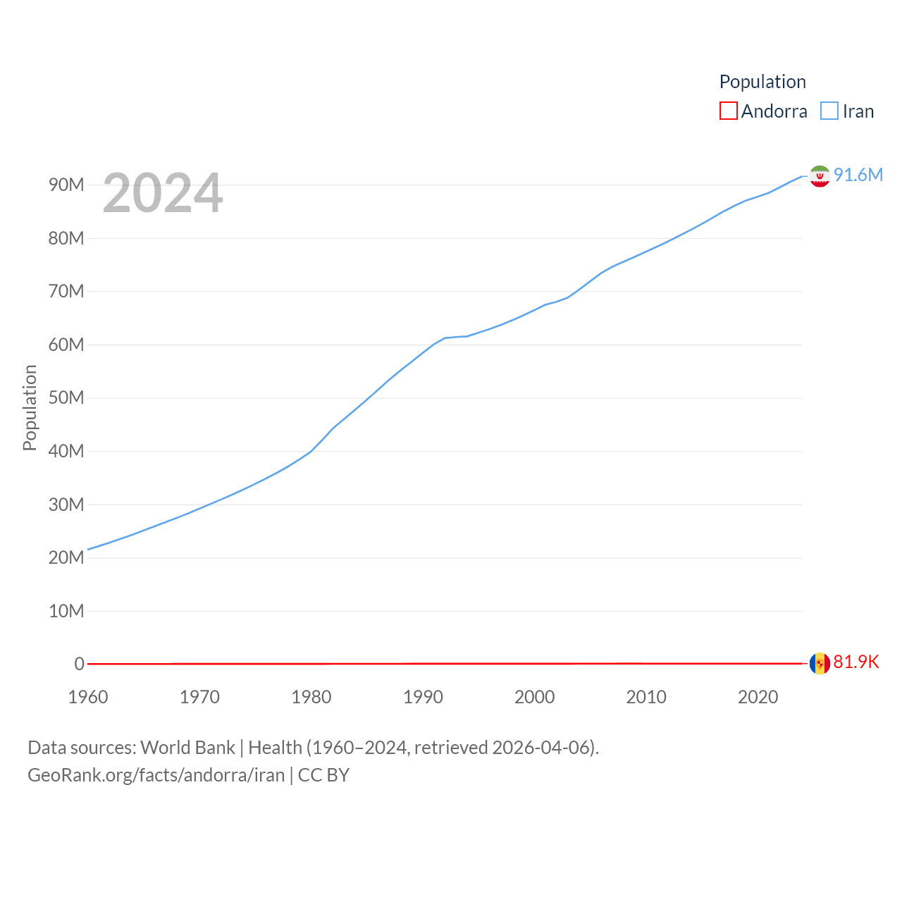 Andorra has a population of 81.9K (ranked 186/197), compared with 91.6M in Iran (ranked 17/197). Andorra's land area is 181.5 sq mi versus 626,451 sq mi for Iran (ranked 179th vs. 17th).