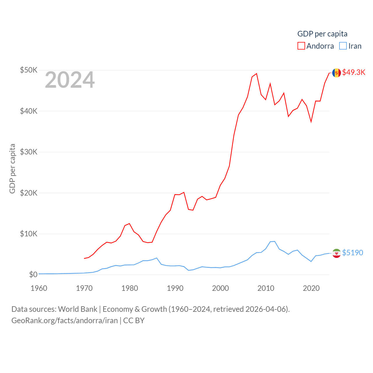 By GDP, Andorra ranks 166/197 ($4.04B) and Iran ranks 34/197 ($475B). By GDP per capita, Andorra ranks 25/197 ($49,304), while Iran ranks 119/197 ($5,190).