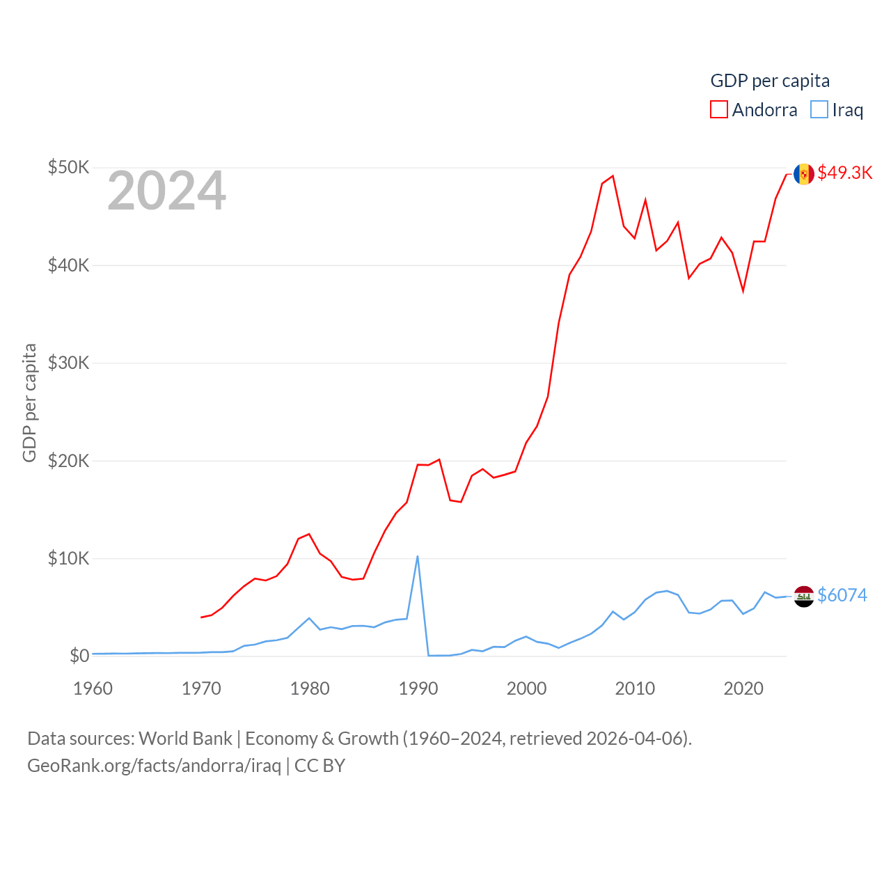By GDP, Andorra ranks 166/197 ($4.04B) and Iraq ranks 50/197 ($280B). By GDP per capita, Andorra ranks 25/197 ($49,304), while Iraq ranks 113/197 ($6,074).