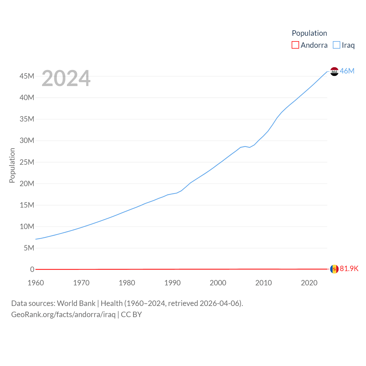 Andorra has a population of 81.9K (ranked 186/197), compared with 46M in Iraq (ranked 34/197). Andorra's land area is 181.5 sq mi versus 167,619 sq mi for Iraq (ranked 179th vs. 57th).
