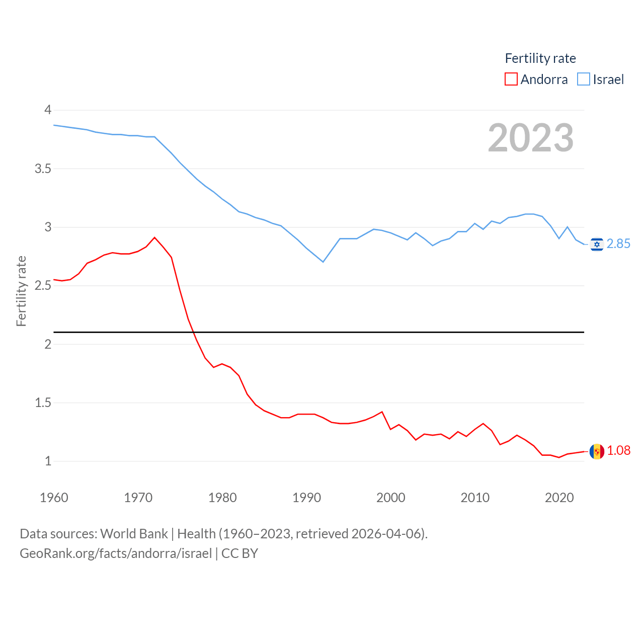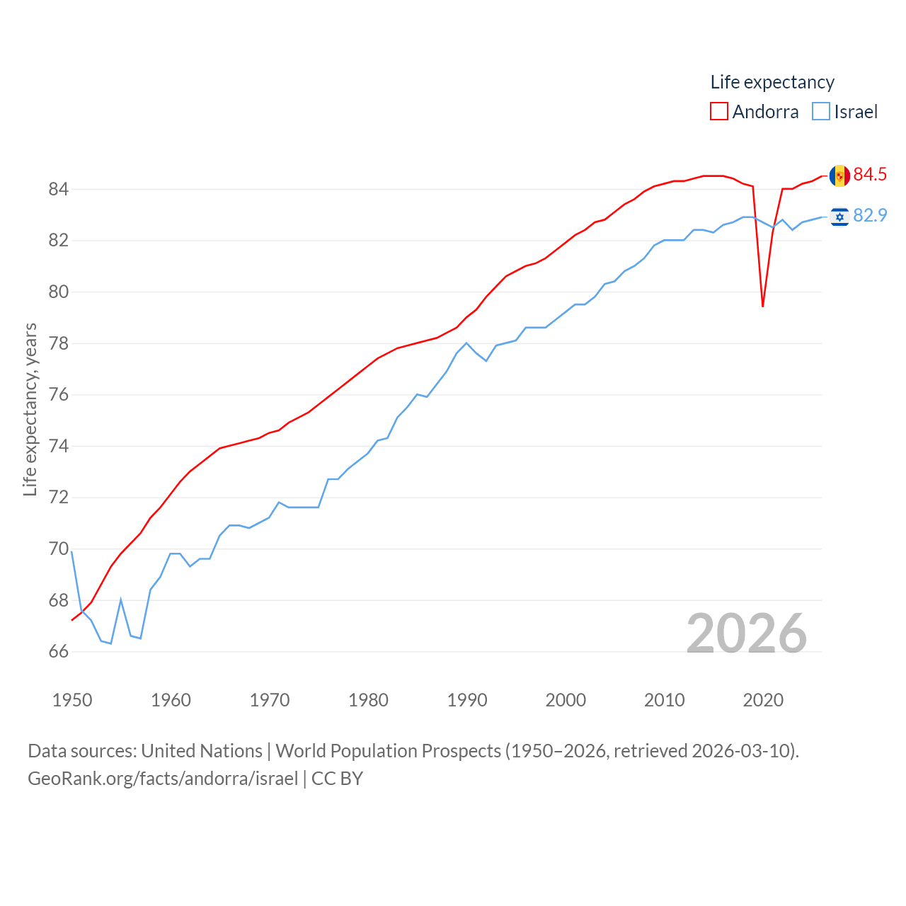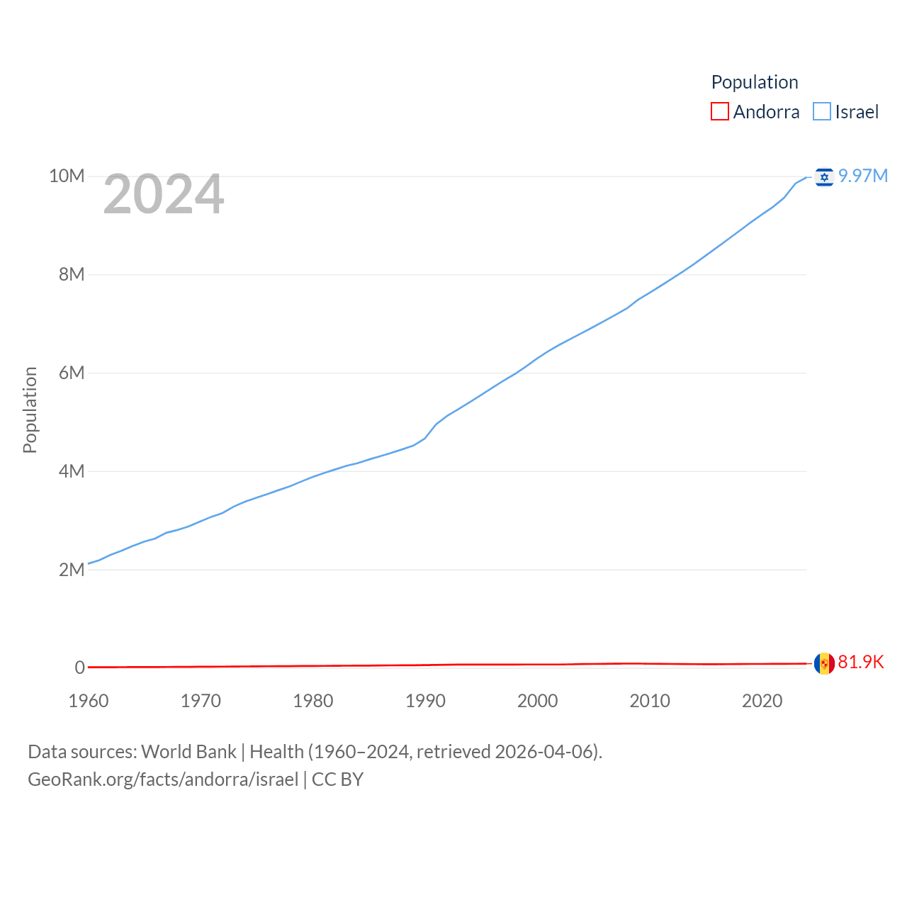 Andorra has a population of 81.9K (ranked 186/197), compared with 9.97M in Israel (ranked 96/197). Andorra's land area is 181.5 sq mi versus 8,355 sq mi for Israel (ranked 179th vs. 149th).