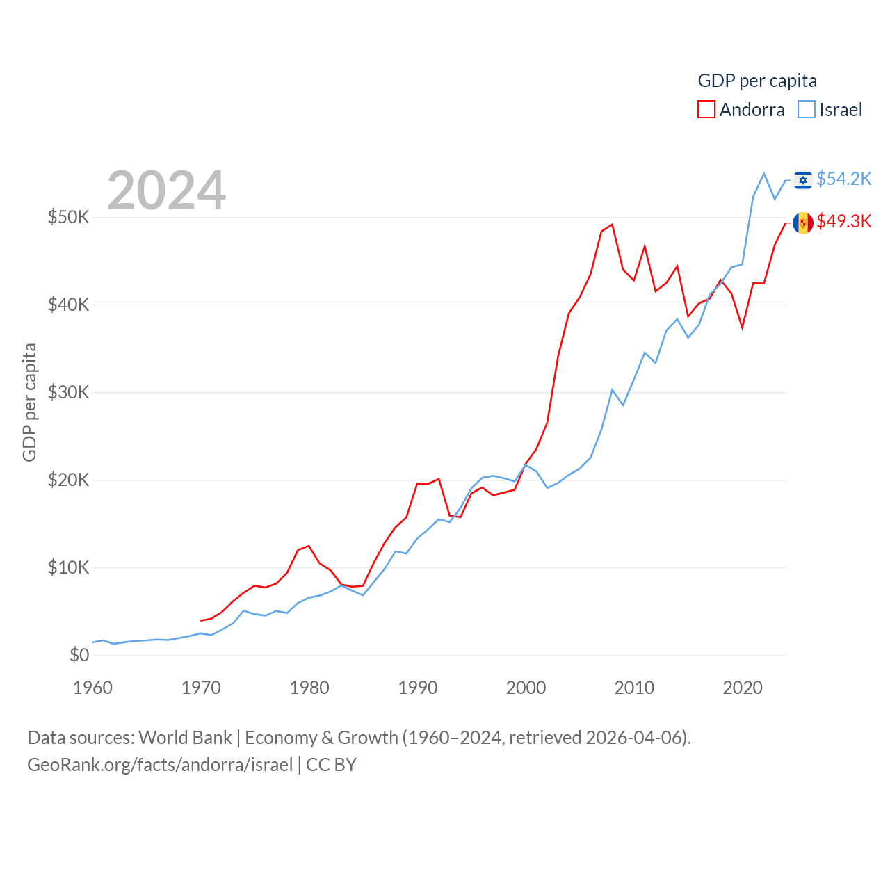 By GDP, Andorra ranks 166/197 ($4.04B) and Israel ranks 29/197 ($540B). By GDP per capita, Andorra ranks 25/197 ($49,304), while Israel ranks 21/197 ($54,177).