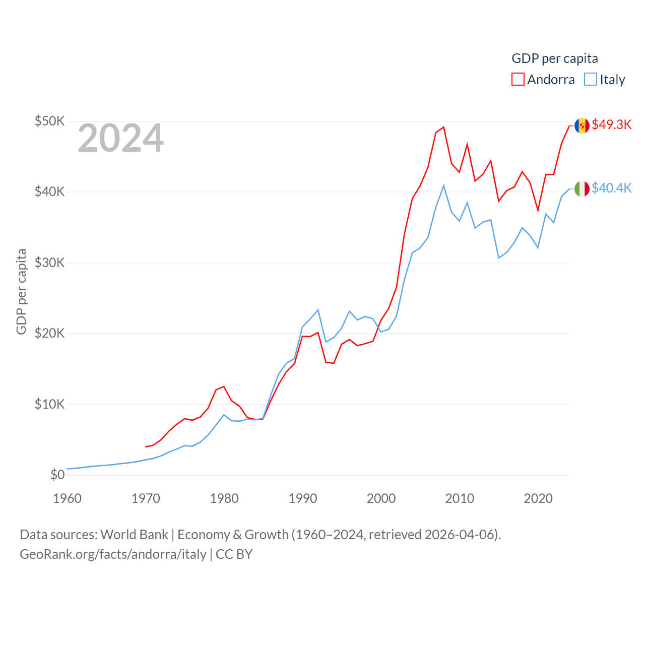 By GDP, Andorra ranks 166/197 ($4.04B) and Italy ranks 8/197 ($2.38T). By GDP per capita, Andorra ranks 25/197 ($49,304), while Italy ranks 29/197 ($40,385).