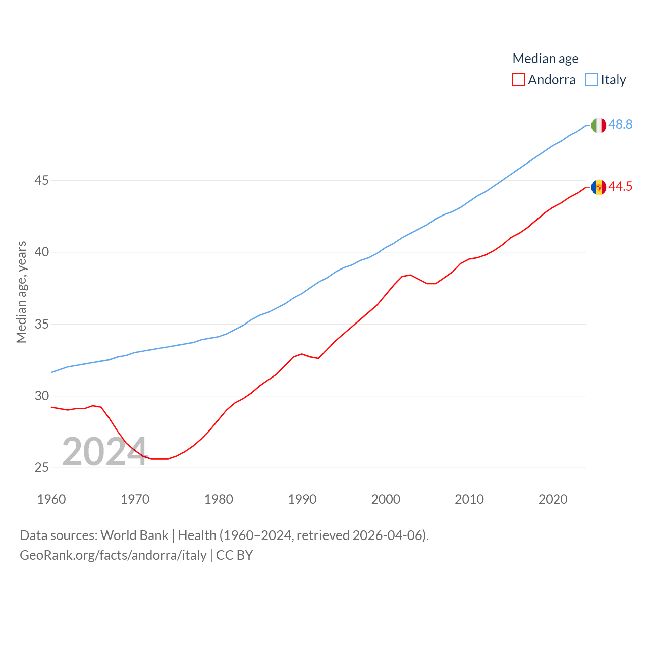Andorra has a population of 81.9K (ranked 186/197), compared with 59M in Italy (ranked 25/197). Andorra's land area is 181.5 sq mi versus 114,178 sq mi for Italy (ranked 179th vs. 72nd).