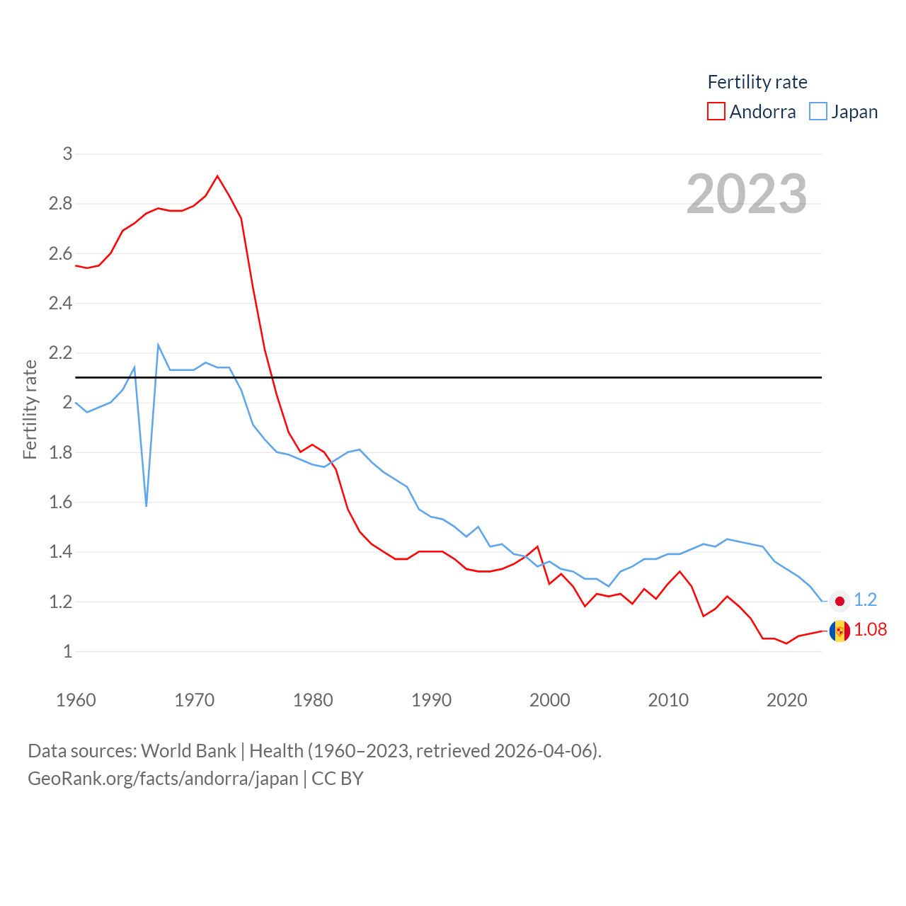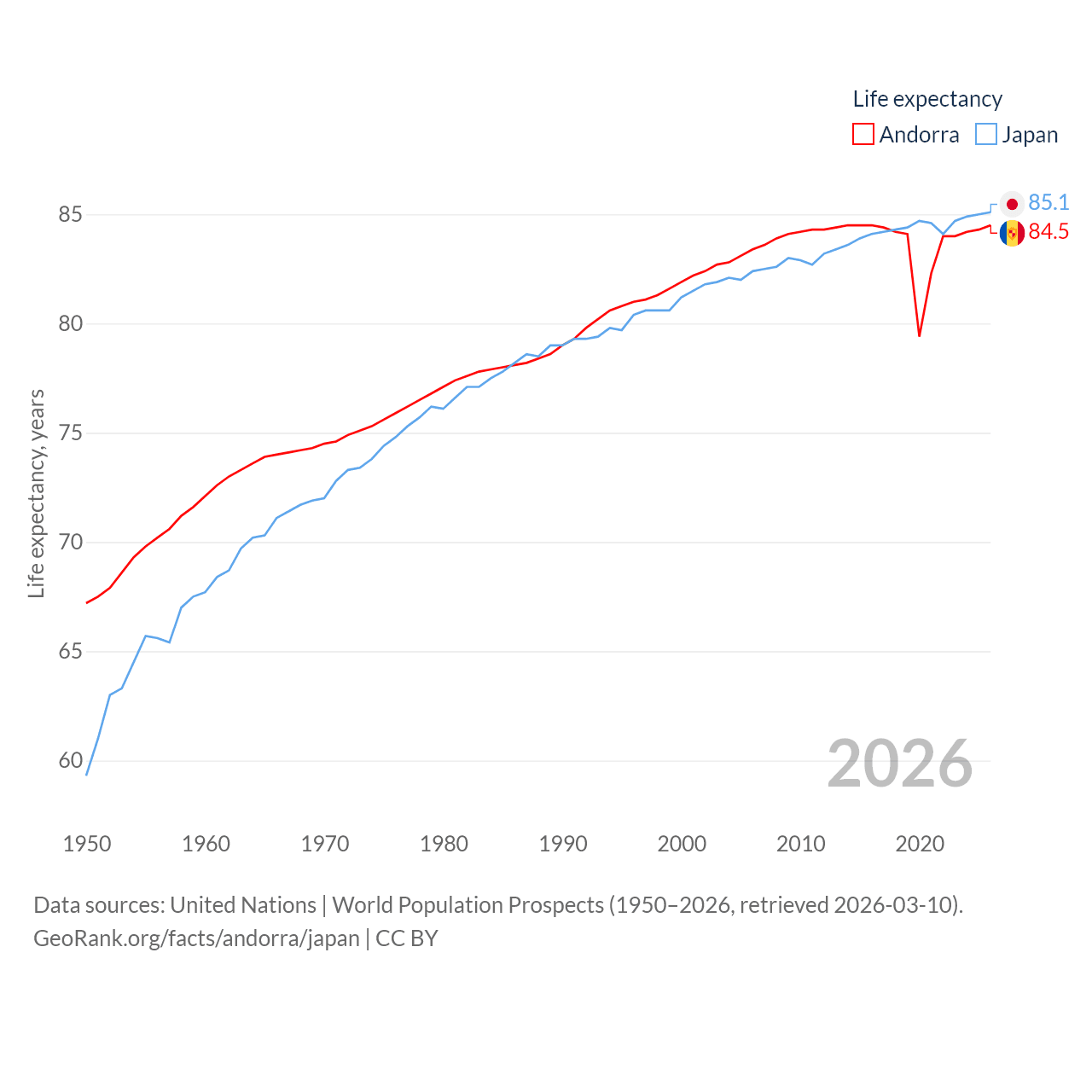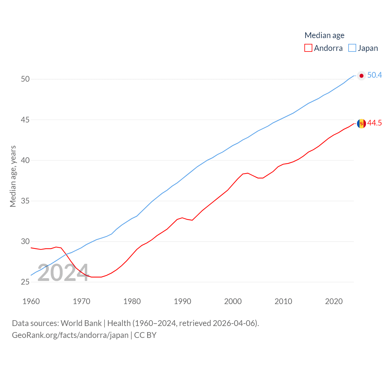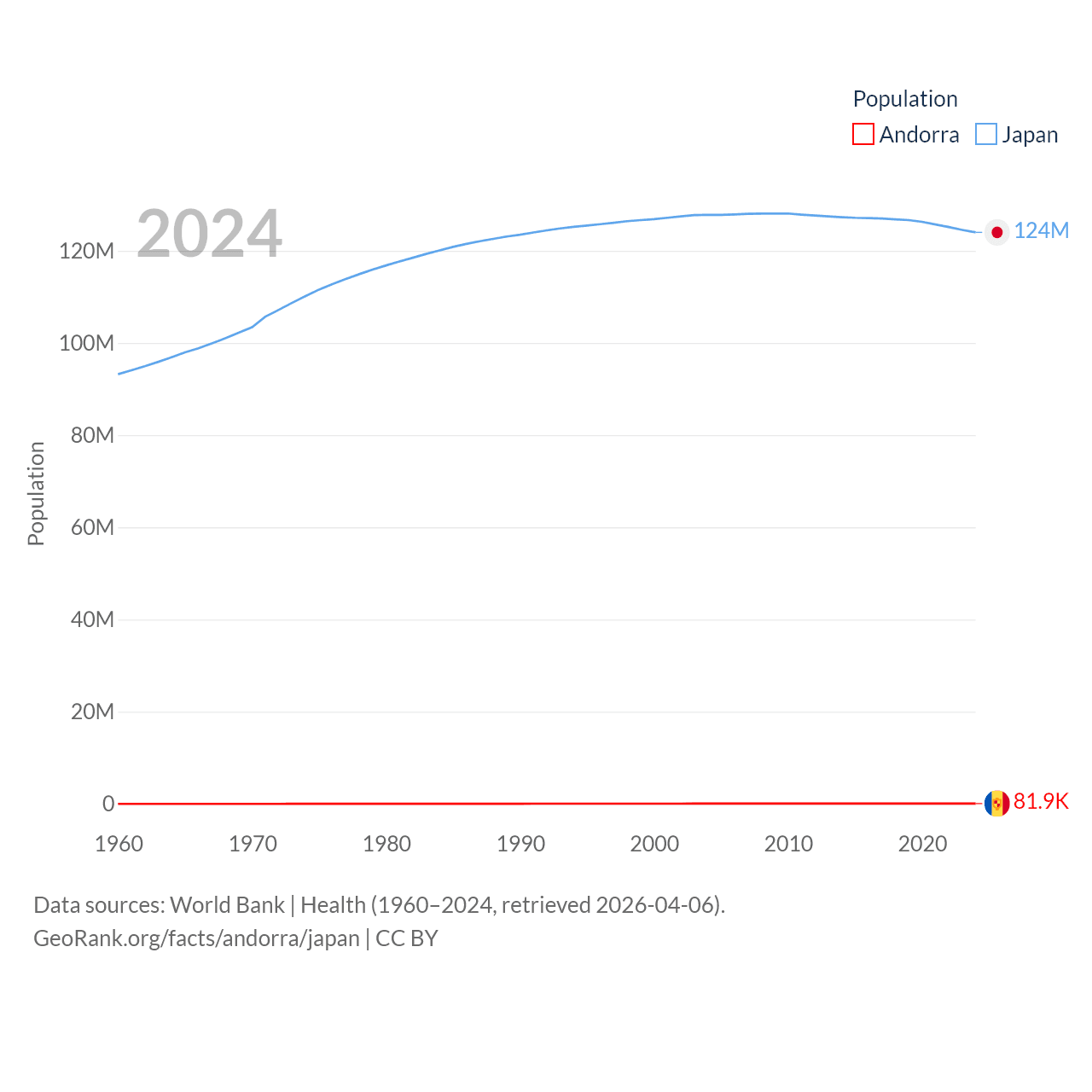 Andorra has a population of 81.9K (ranked 186/197), compared with 124M in Japan (ranked 12/197). Andorra's land area is 181.5 sq mi versus 140,761 sq mi for Japan (ranked 179th vs. 61st).