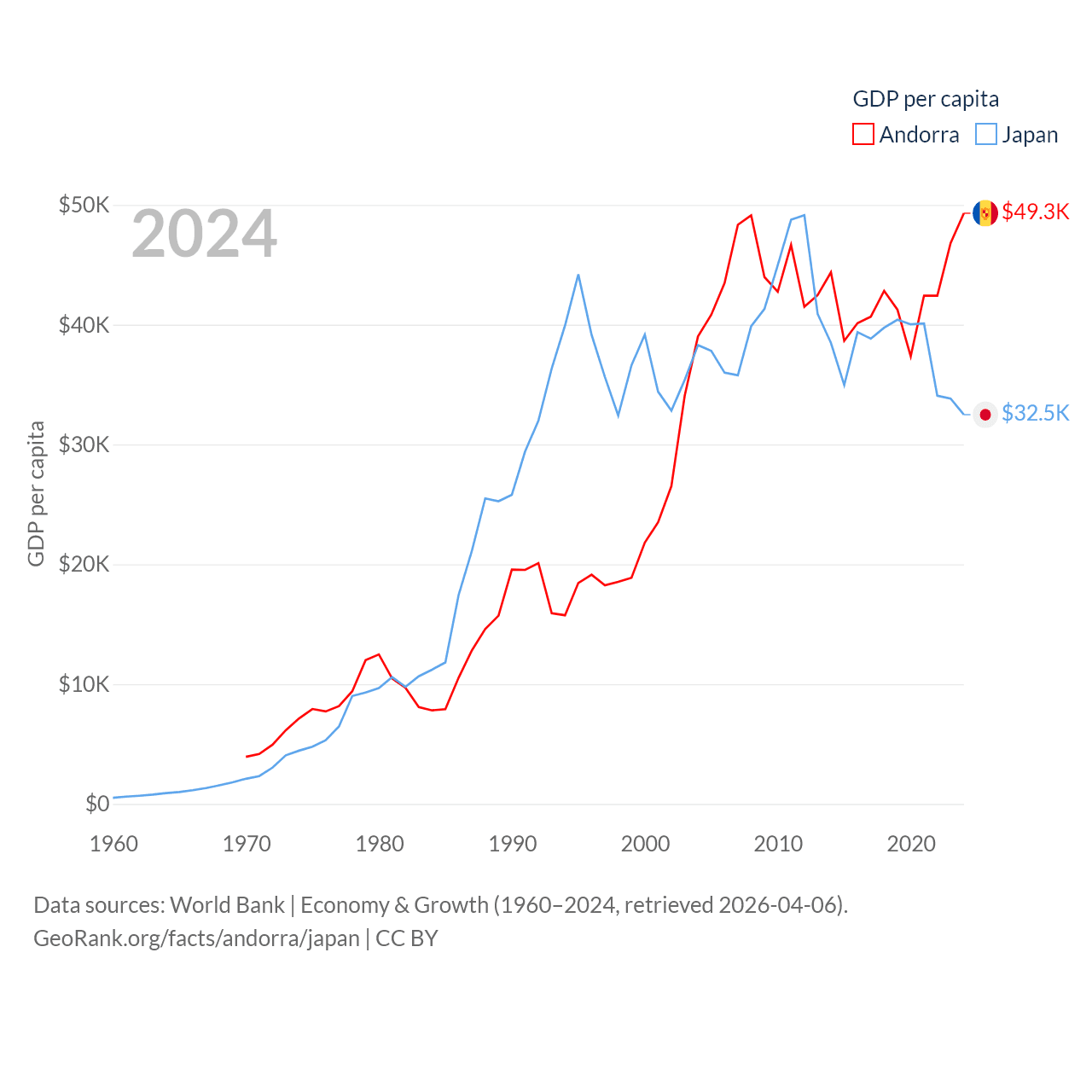 By GDP, Andorra ranks 166/197 ($4.04B) and Japan ranks 4/197 ($4.03T). By GDP per capita, Andorra ranks 25/197 ($49,304), while Japan ranks 38/197 ($32,487).