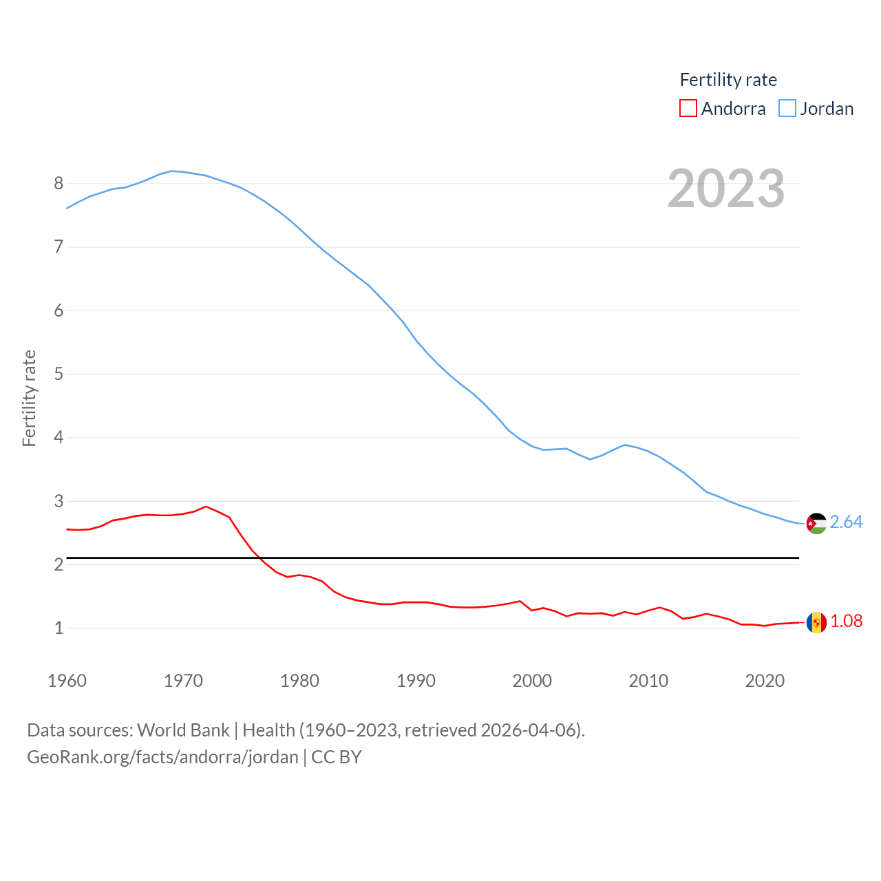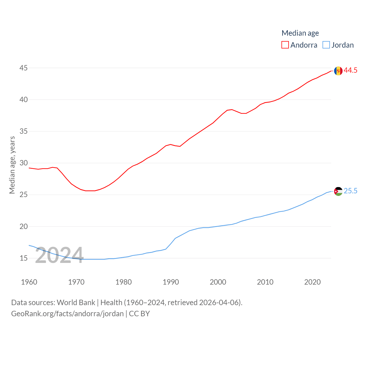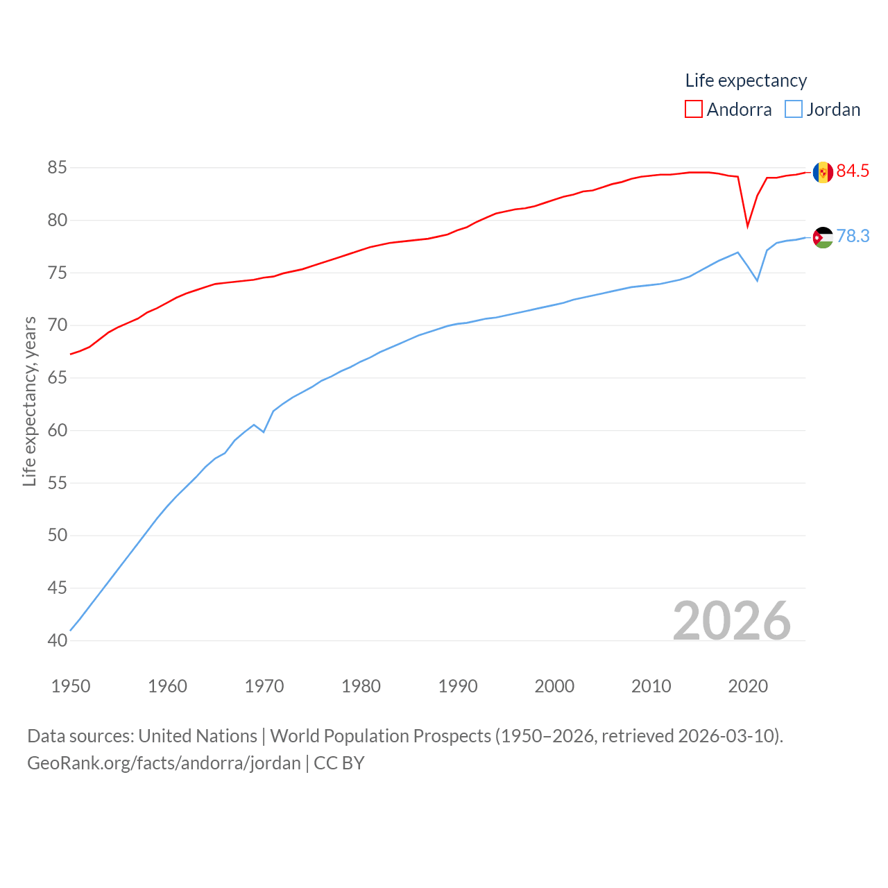 Andorra has a population of 81.9K (ranked 186/197), compared with 11.6M in Jordan (ranked 84/197). Andorra's land area is 181.5 sq mi versus 34,284 sq mi for Jordan (ranked 179th vs. 110th).