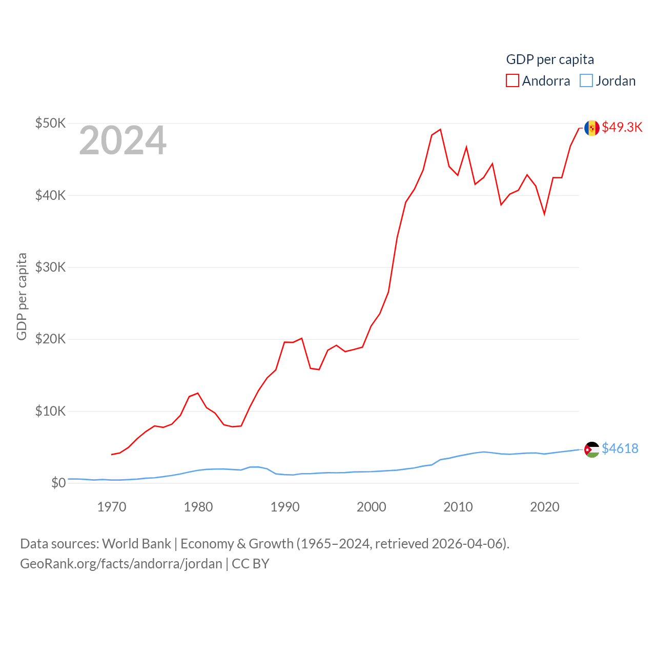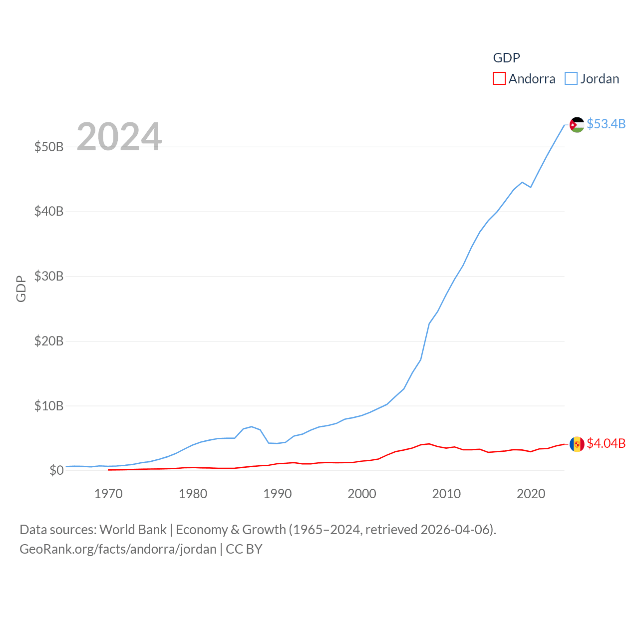 By GDP, Andorra ranks 166/197 ($4.04B) and Jordan ranks 90/197 ($53.4B). By GDP per capita, Andorra ranks 25/197 ($49,304), while Jordan ranks 123/197 ($4,618).