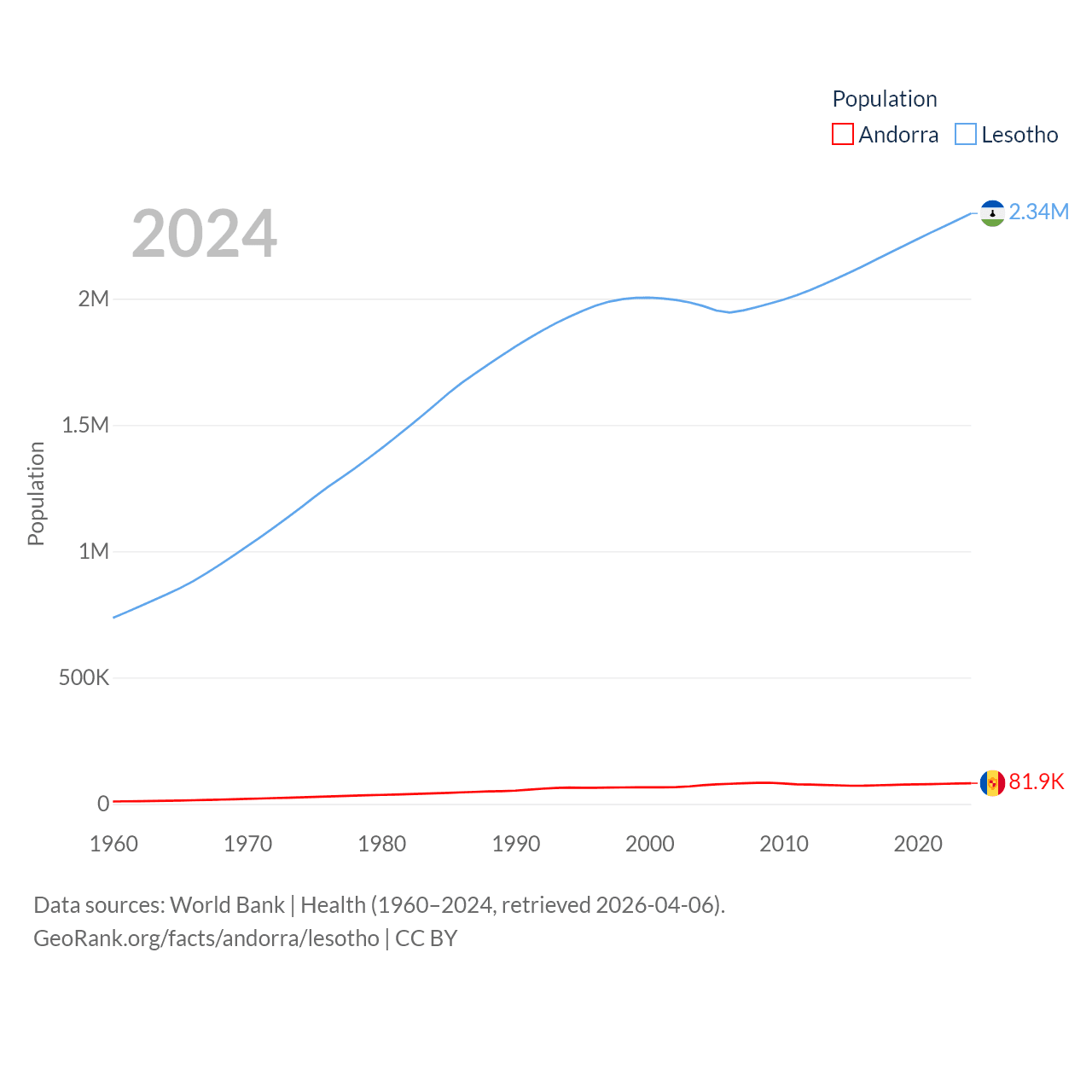 Andorra has a population of 81.9K (ranked 186/197), compared with 2.34M in Lesotho (ranked 145/197). Andorra's land area is 181.5 sq mi versus 11,722 sq mi for Lesotho (ranked 179th vs. 137th).
