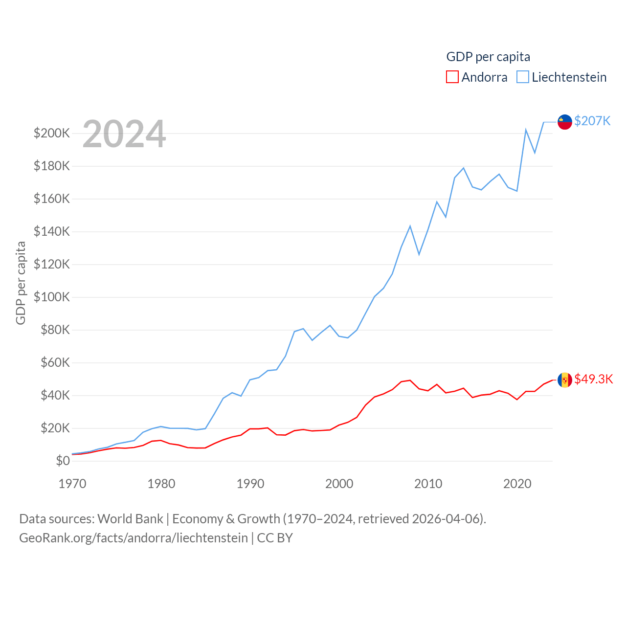 By GDP, Andorra ranks 166/197 ($4.04B) and Liechtenstein ranks 156/197 ($8.24B). By GDP per capita, Andorra ranks 25/197 ($49,304), while Liechtenstein ranks 2/197 ($206,781).