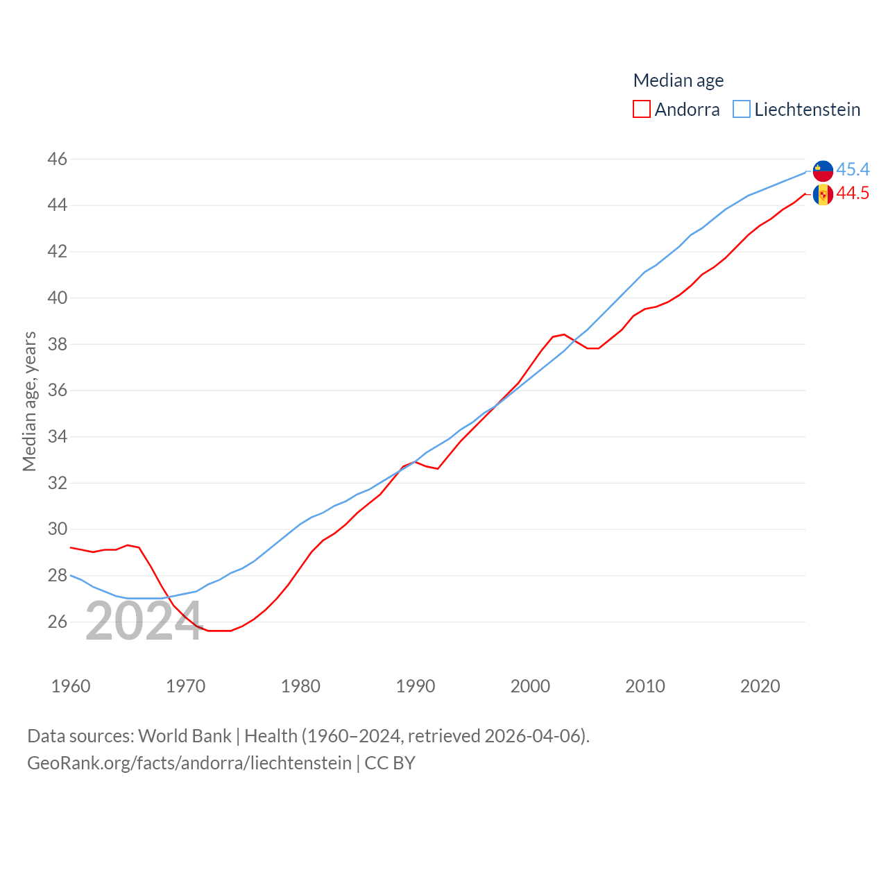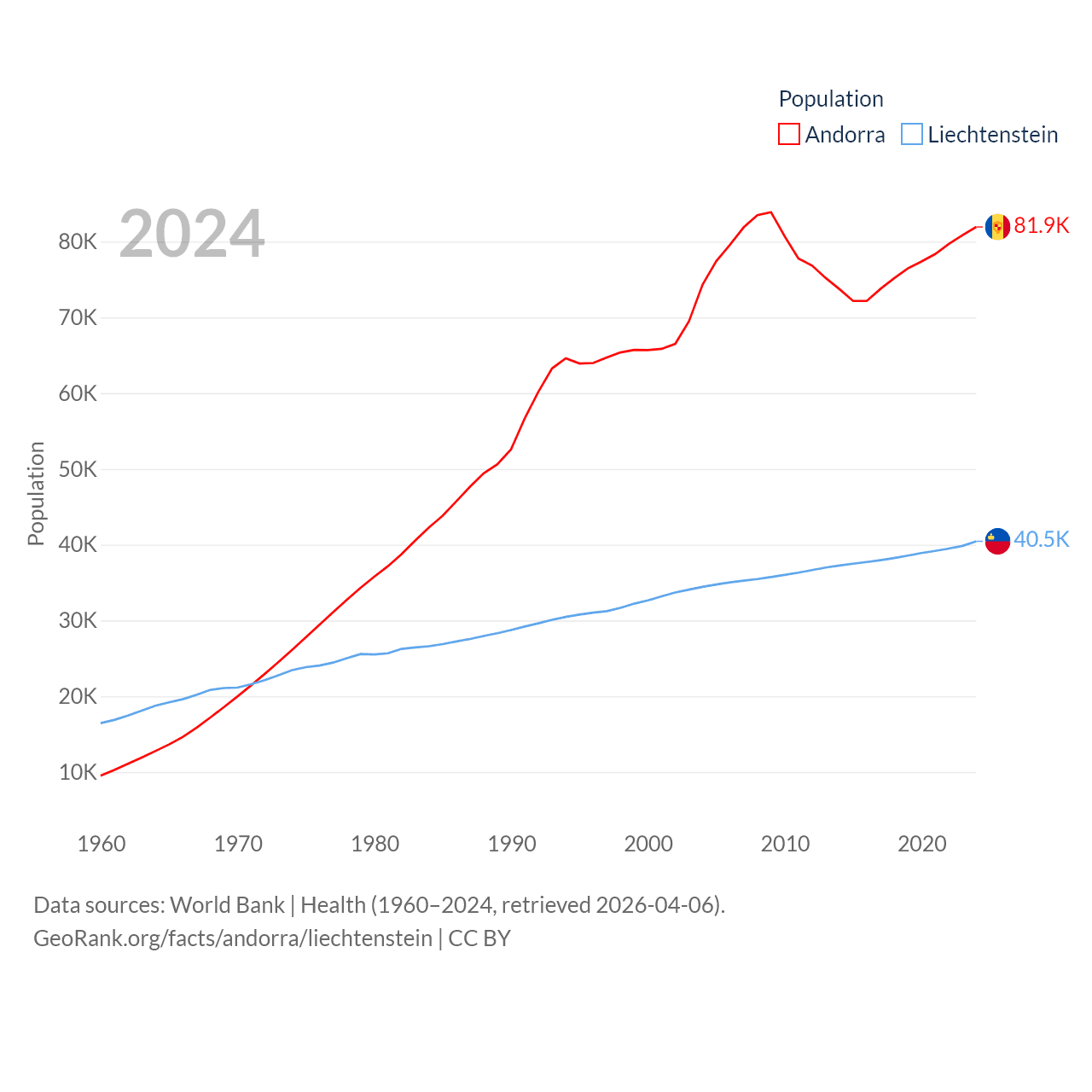 Andorra has a population of 81.9K (ranked 186/197), compared with 40.4K in Liechtenstein (ranked 190/197). Andorra's land area is 181.5 sq mi versus 61.8 sq mi for Liechtenstein (ranked 179th vs. 192nd).