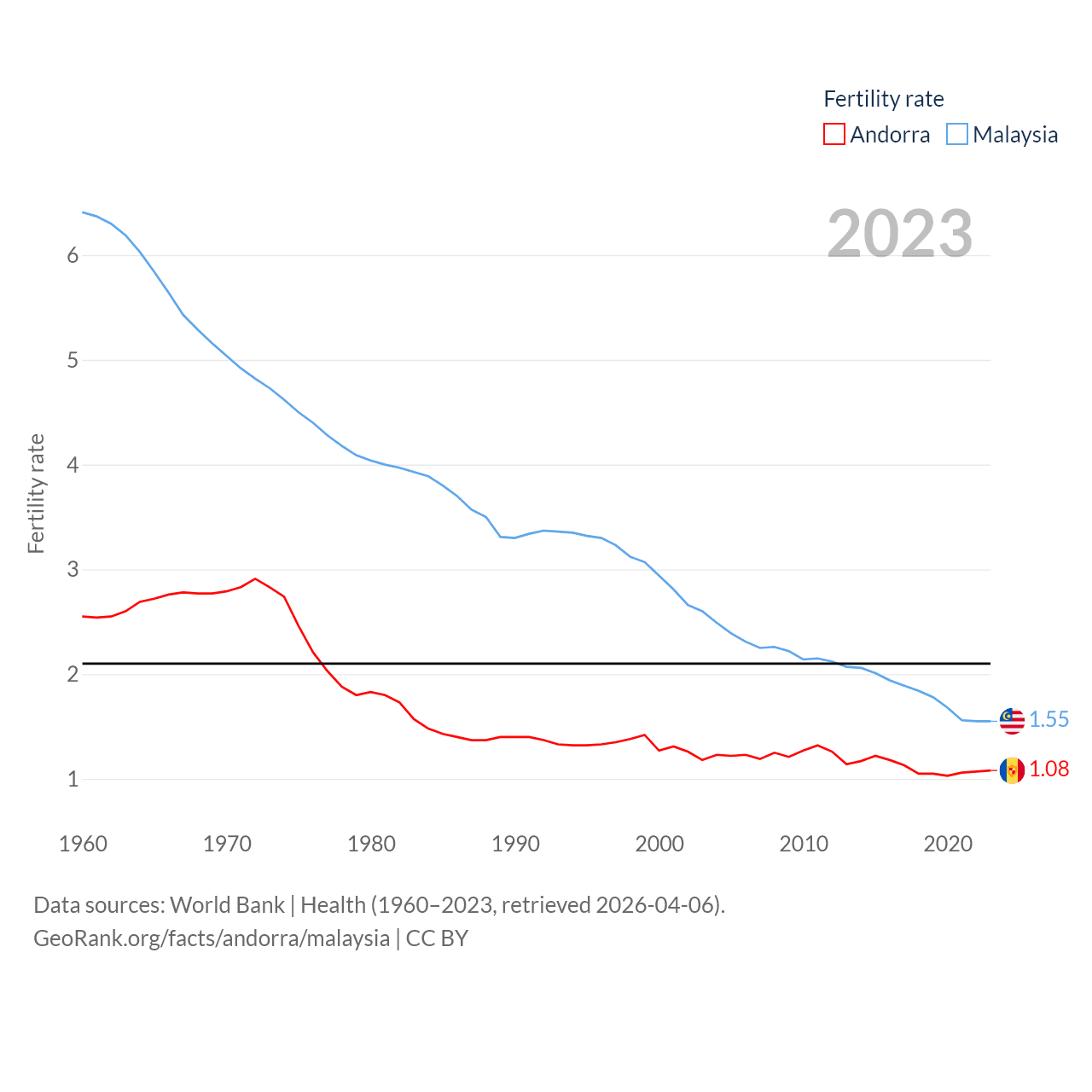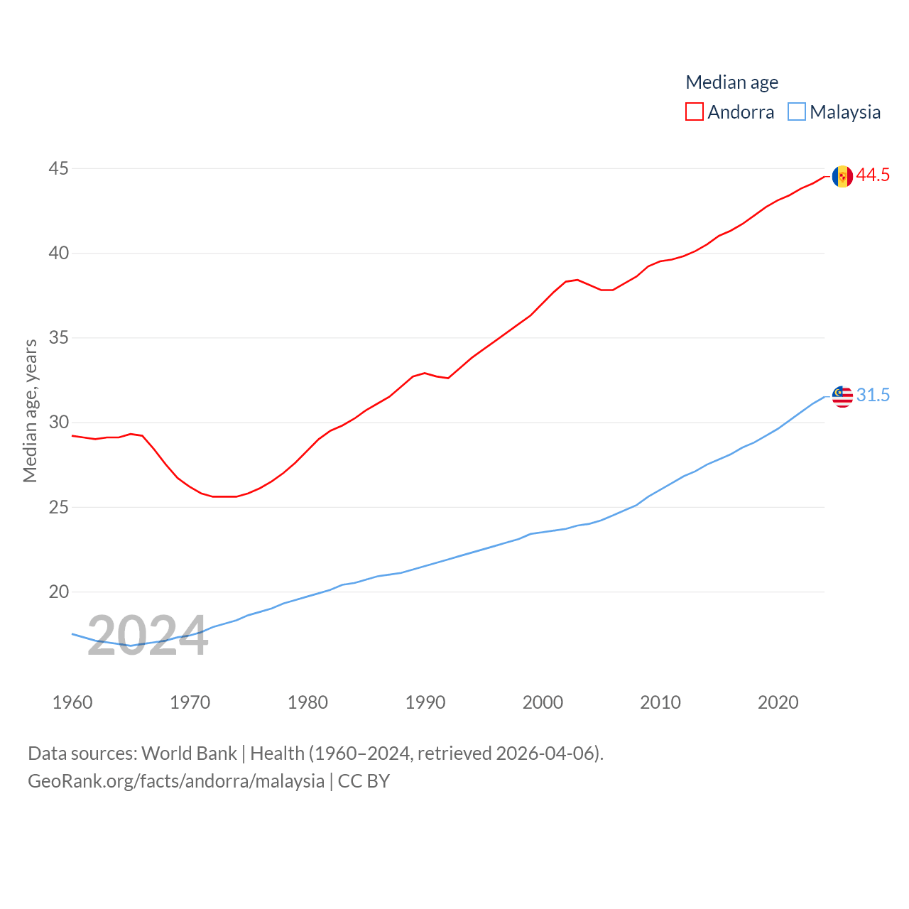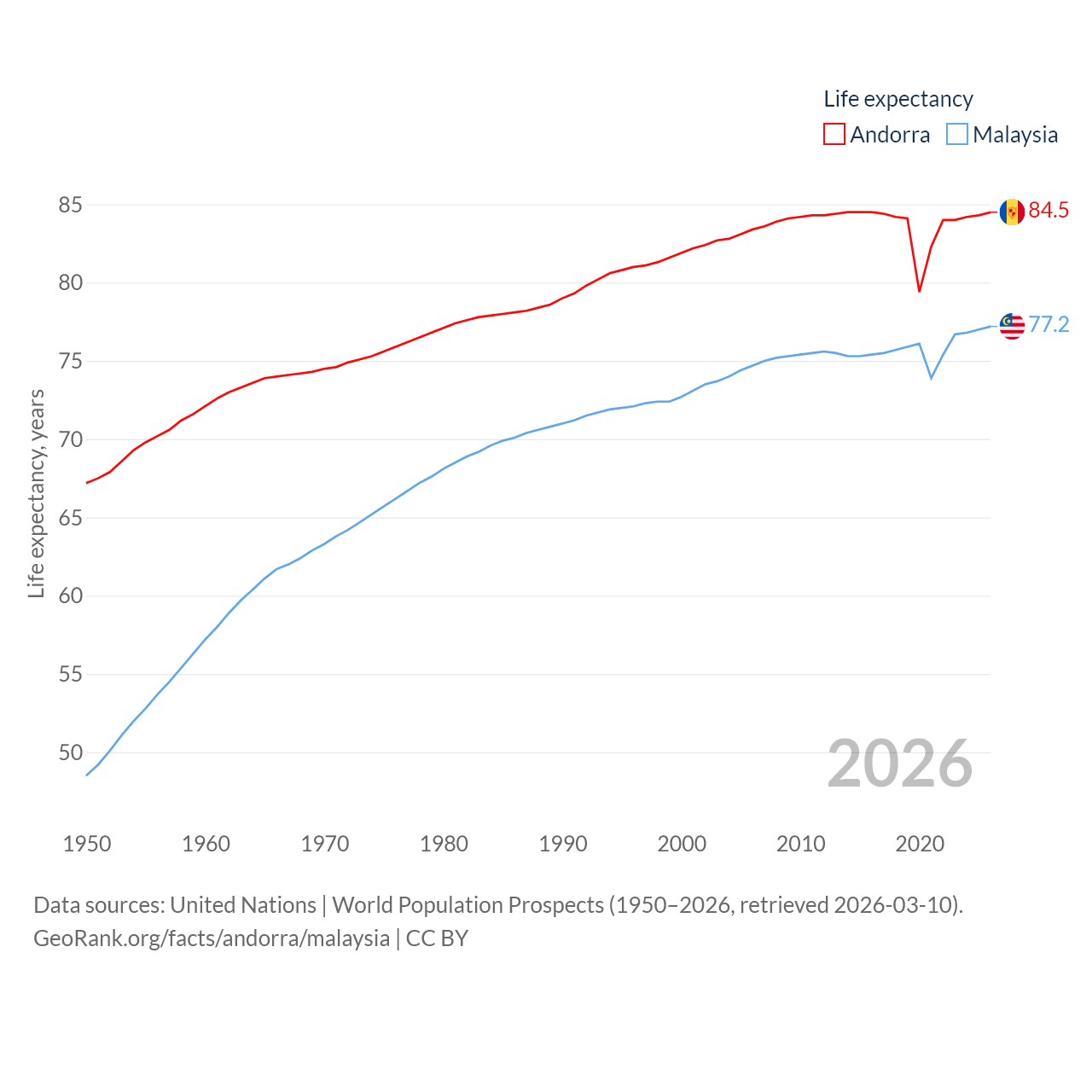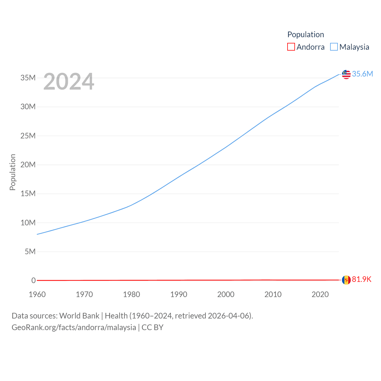 Andorra has a population of 81.9K (ranked 186/197), compared with 35.6M in Malaysia (ranked 44/197). Andorra's land area is 181.5 sq mi versus 126,854 sq mi for Malaysia (ranked 179th vs. 65th).