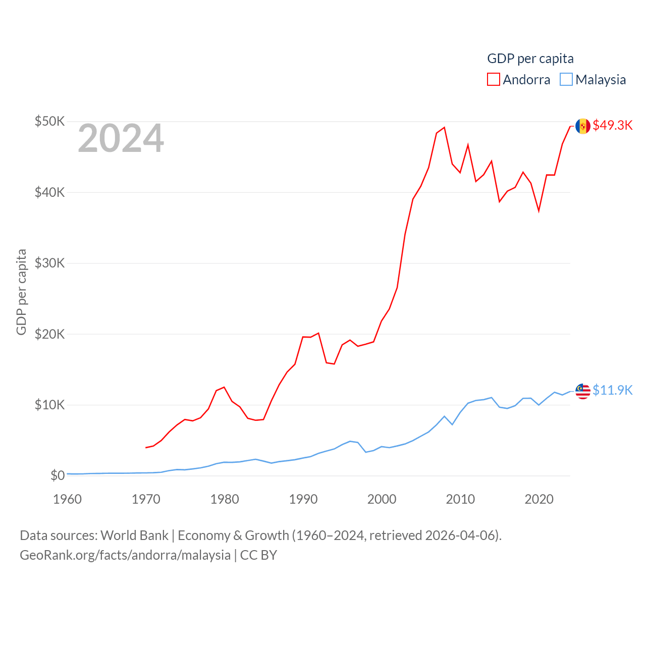 By GDP, Andorra ranks 166/197 ($4.04B) and Malaysia ranks 38/197 ($422B). By GDP per capita, Andorra ranks 25/197 ($49,304), while Malaysia ranks 79/197 ($11,874).