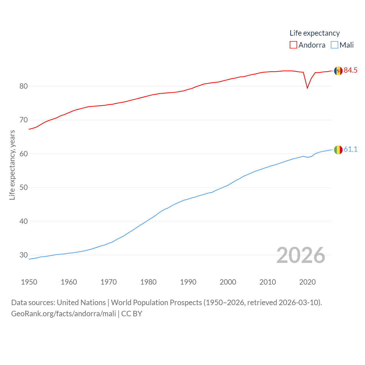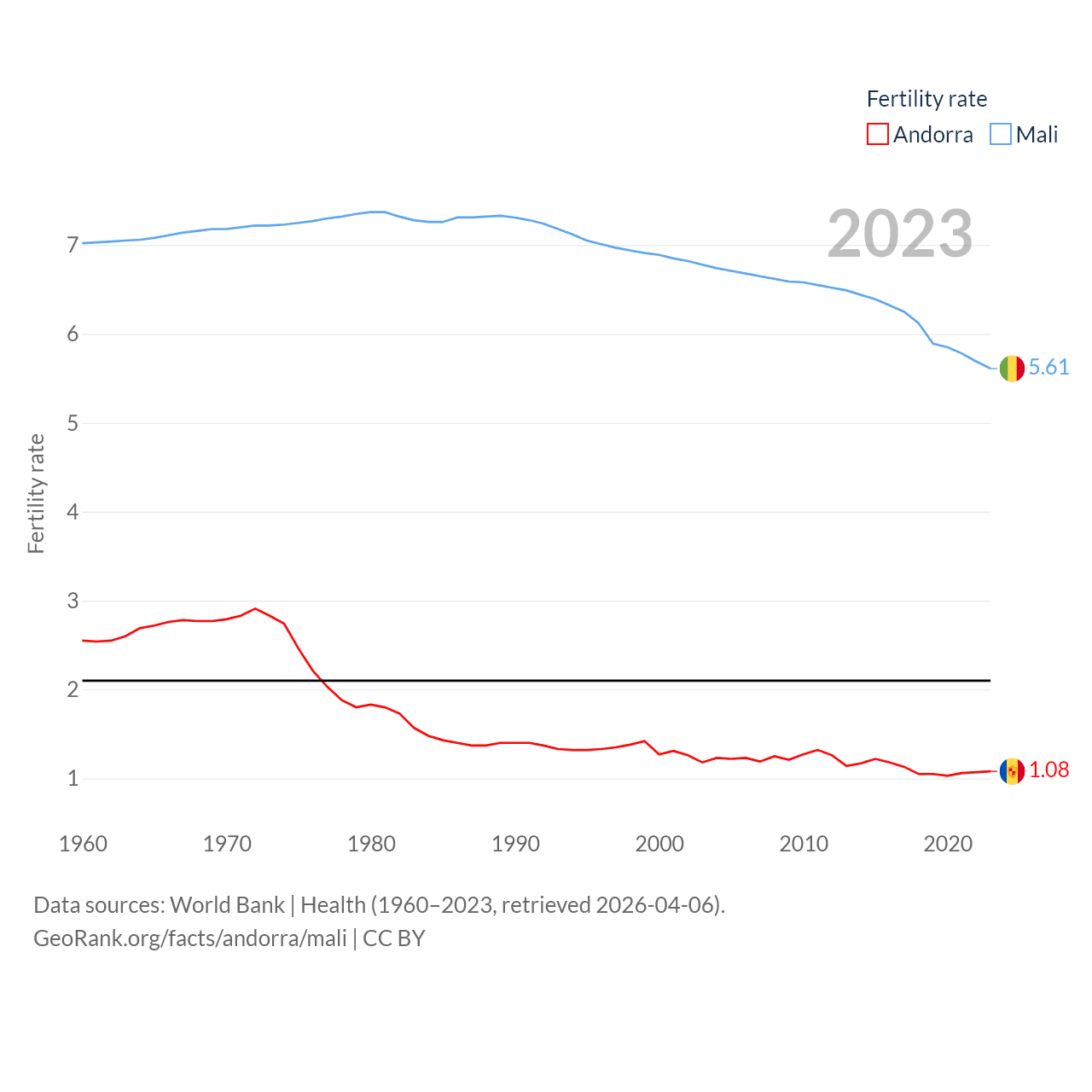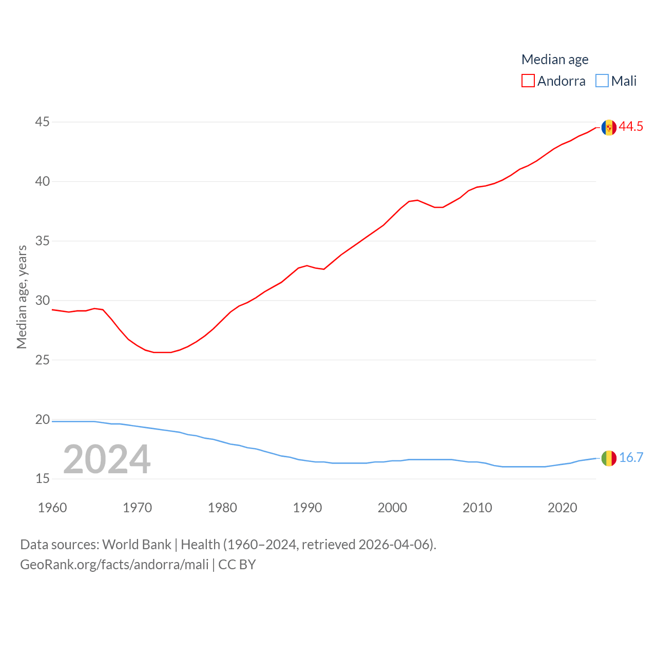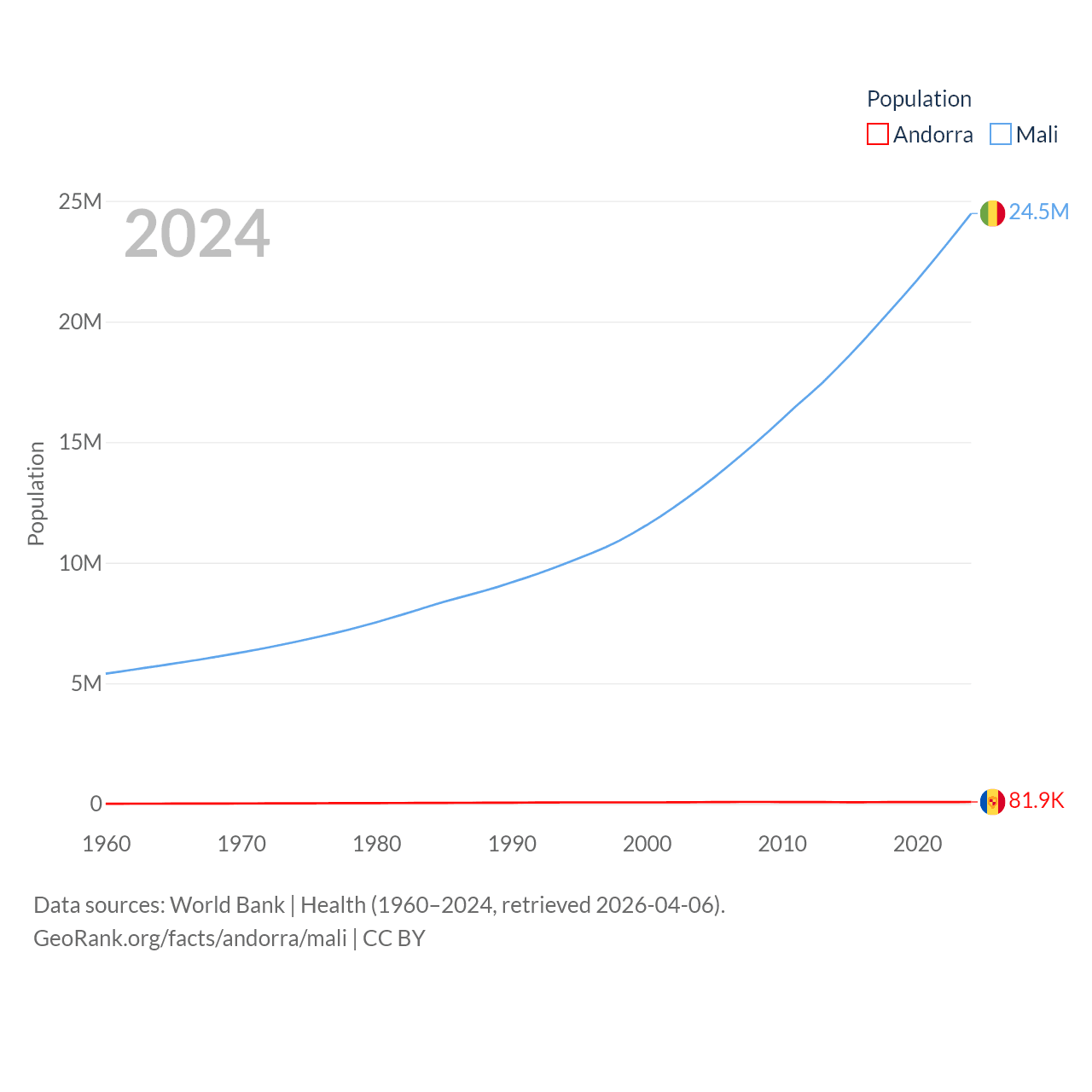 Andorra has a population of 81.9K (ranked 186/197), compared with 24.5M in Mali (ranked 58/197). Andorra's land area is 181.5 sq mi versus 471,118 sq mi for Mali (ranked 179th vs. 23rd).