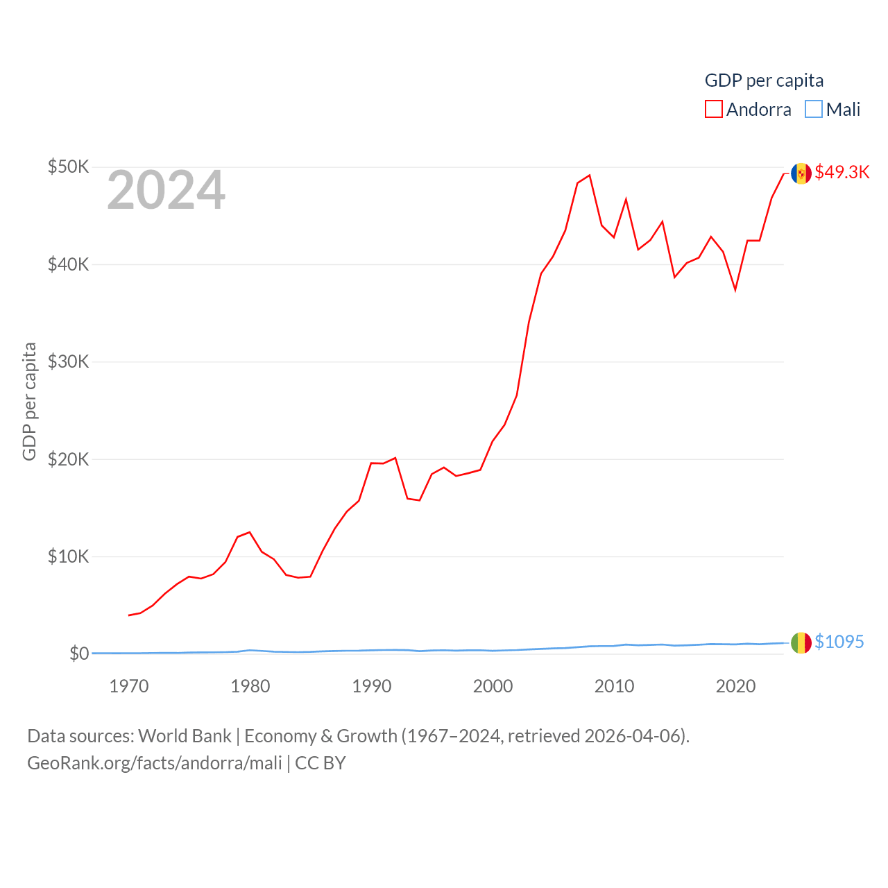 By GDP, Andorra ranks 166/197 ($4.04B) and Mali ranks 113/197 ($26.8B). By GDP per capita, Andorra ranks 25/197 ($49,304), while Mali ranks 173/197 ($1,095).