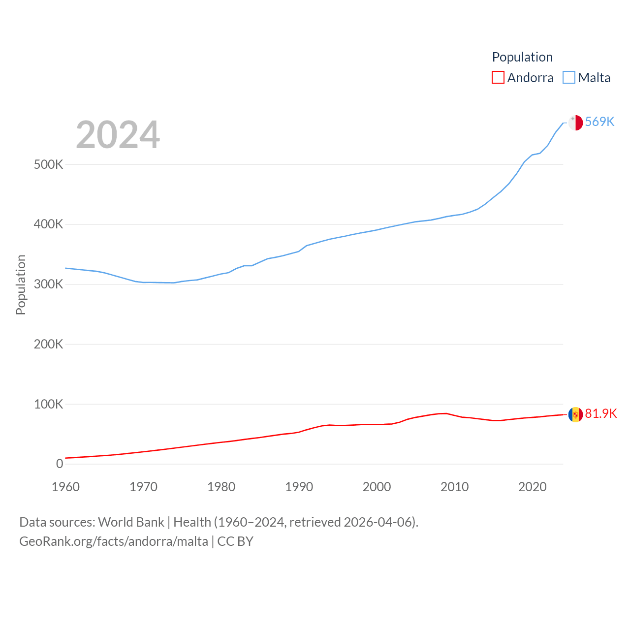 Andorra has a population of 81.9K (ranked 186/197), compared with 569K in Malta (ranked 167/197). Andorra's land area is 181.5 sq mi versus 123.6 sq mi for Malta (ranked 179th vs. 187th).