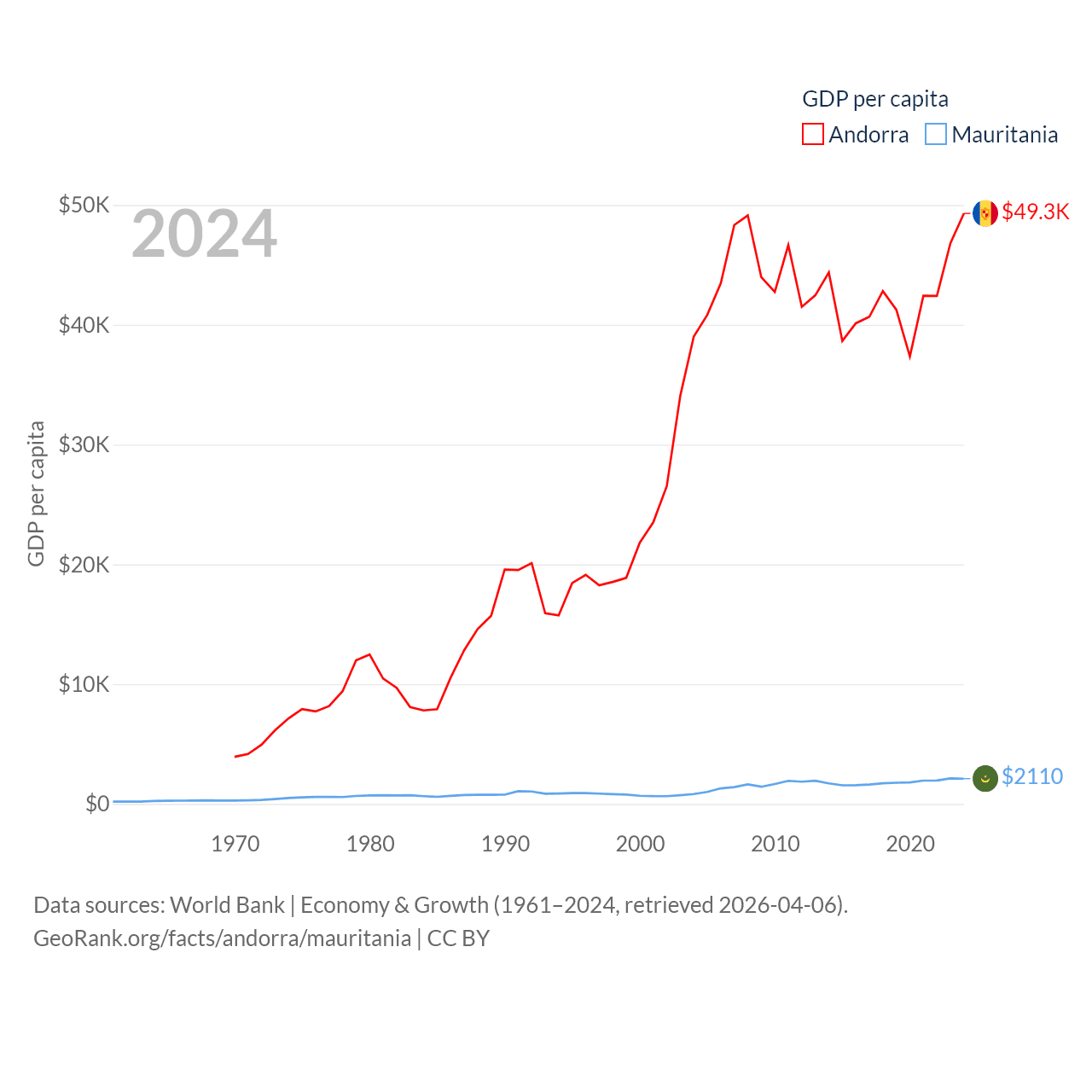 By GDP, Andorra ranks 166/197 ($4.04B) and Mauritania ranks 153/197 ($10.9B). By GDP per capita, Andorra ranks 25/197 ($49,304), while Mauritania ranks 156/197 ($2,110).