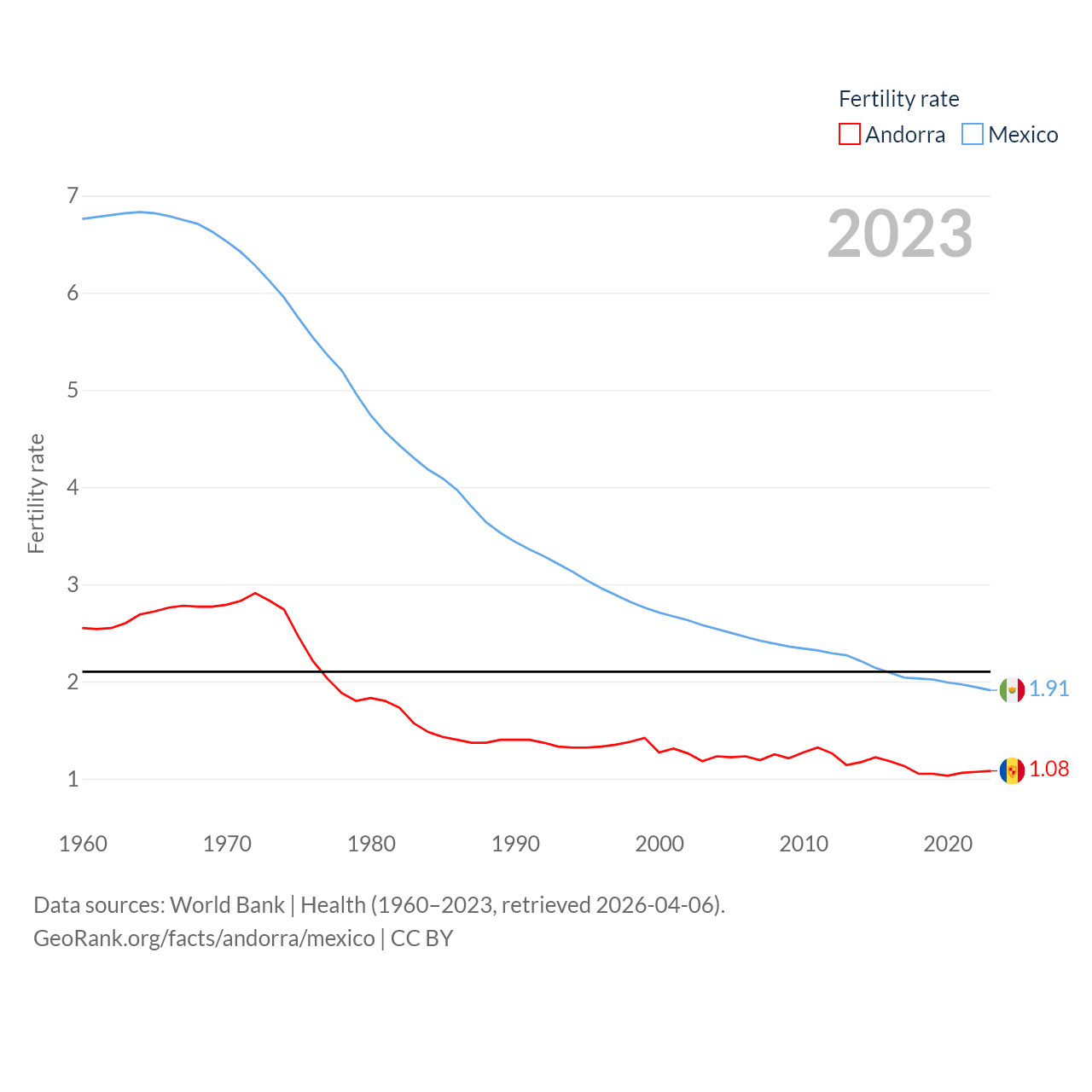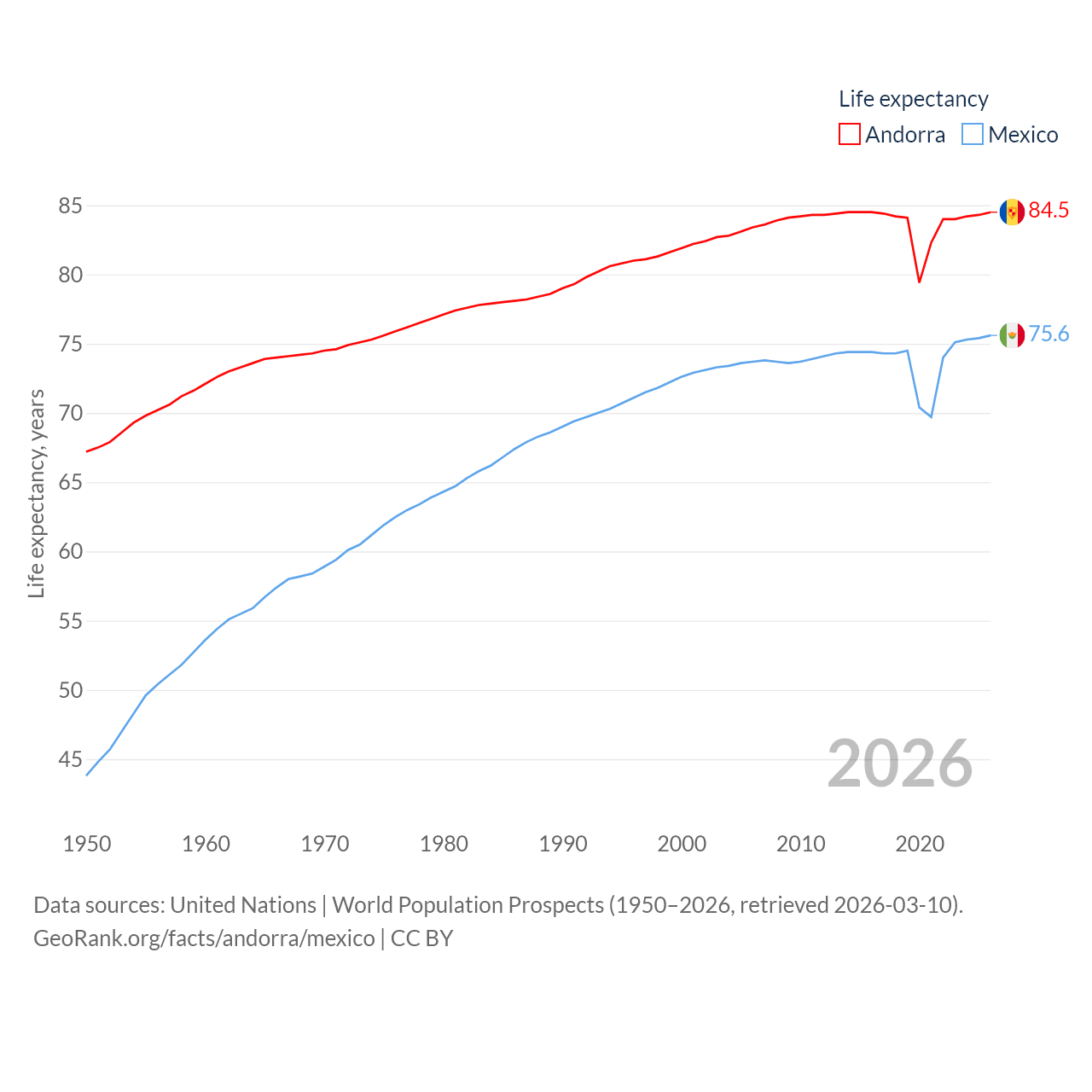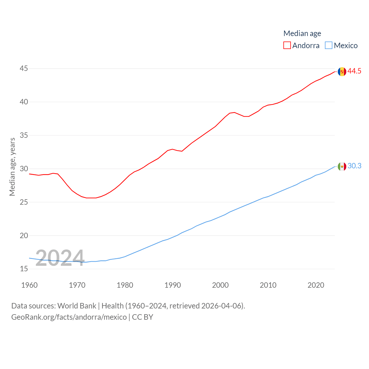 Andorra has a population of 81.9K (ranked 186/197), compared with 131M in Mexico (ranked 11/197). Andorra's land area is 181.5 sq mi versus 750,563 sq mi for Mexico (ranked 179th vs. 13th).