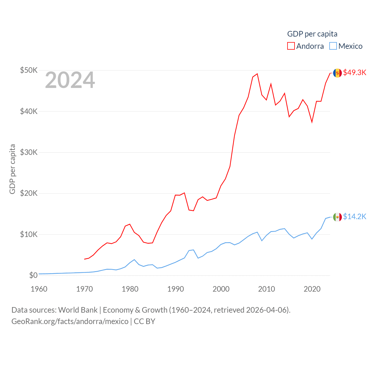 By GDP, Andorra ranks 166/197 ($4.04B) and Mexico ranks 13/197 ($1.86T). By GDP per capita, Andorra ranks 25/197 ($49,304), while Mexico ranks 69/197 ($14,186).