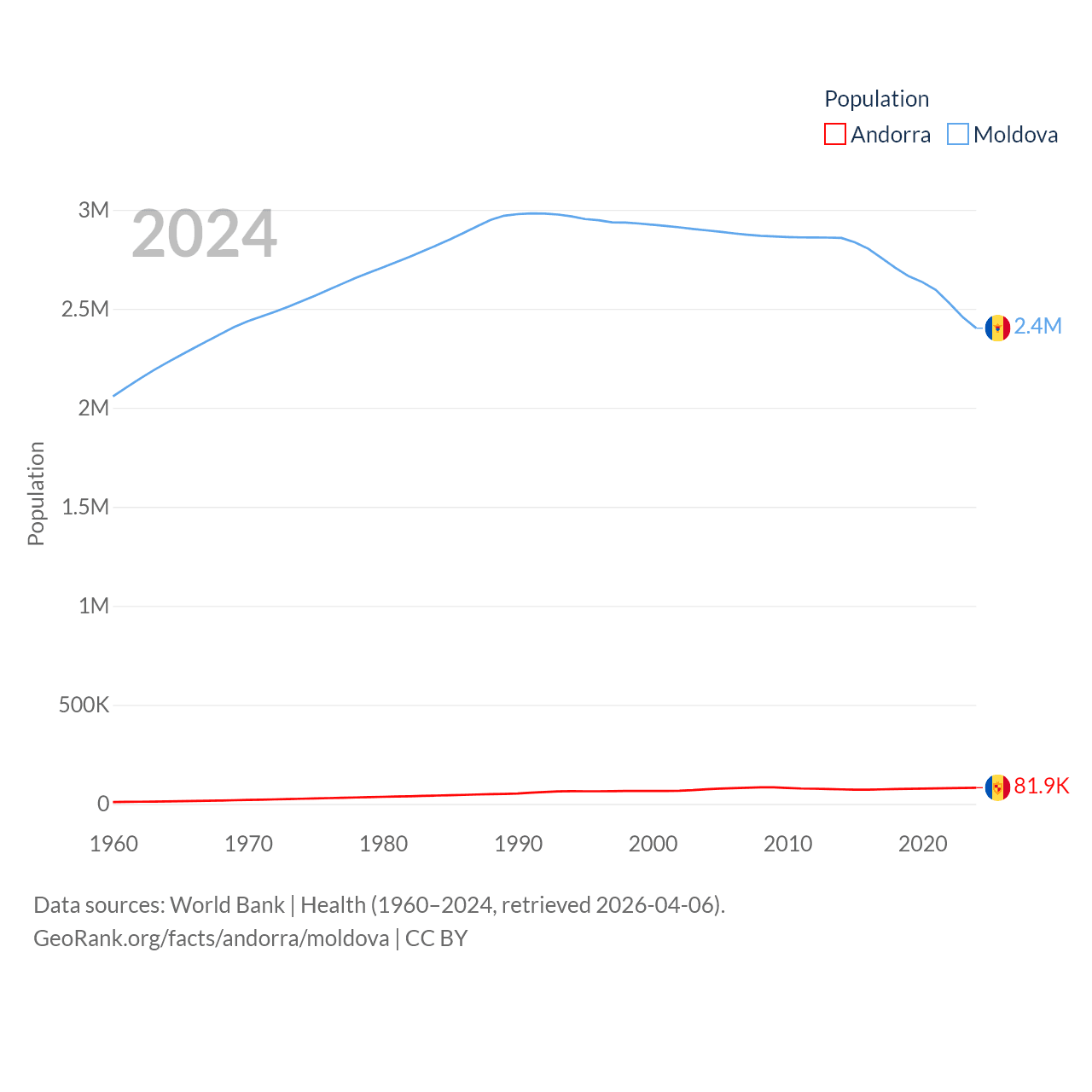 Andorra has a population of 81.9K (ranked 186/197), compared with 2.4M in Moldova (ranked 143/197). Andorra's land area is 181.5 sq mi versus 12,714 sq mi for Moldova (ranked 179th vs. 135th).