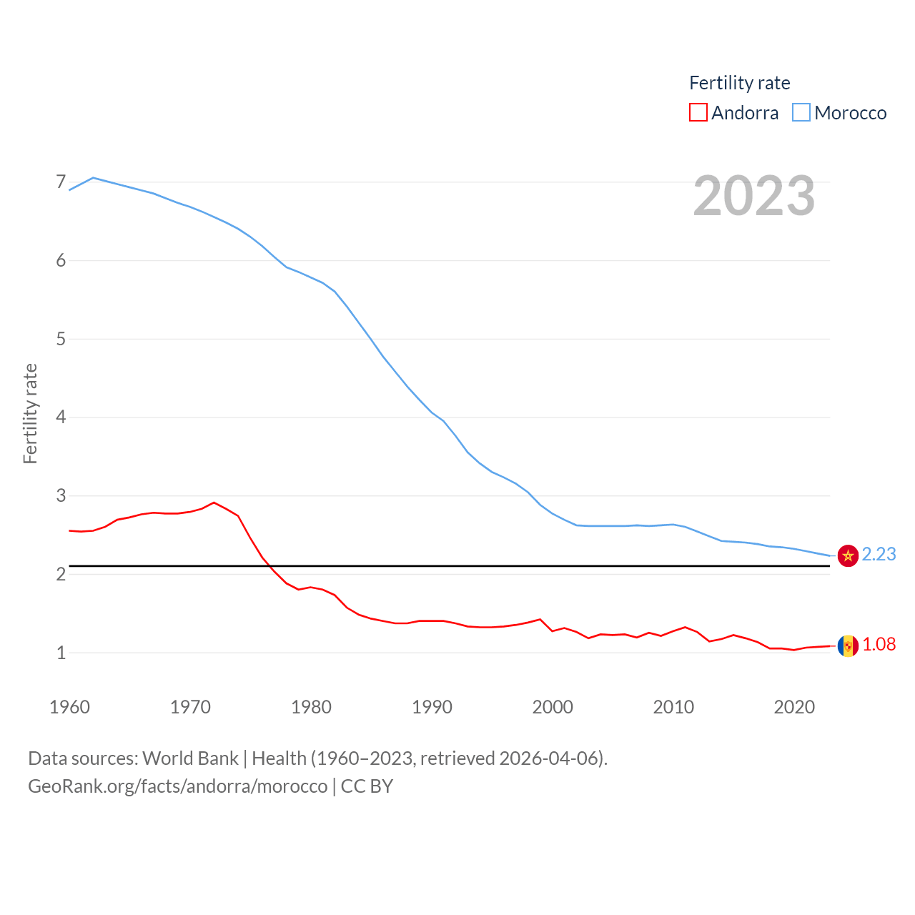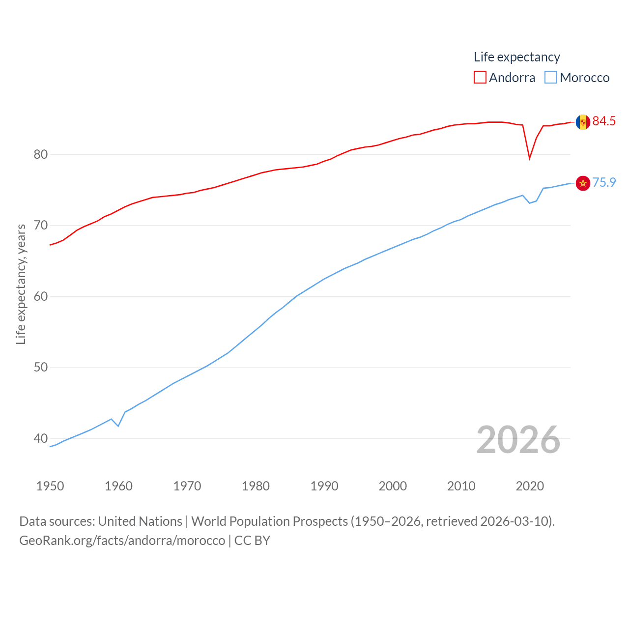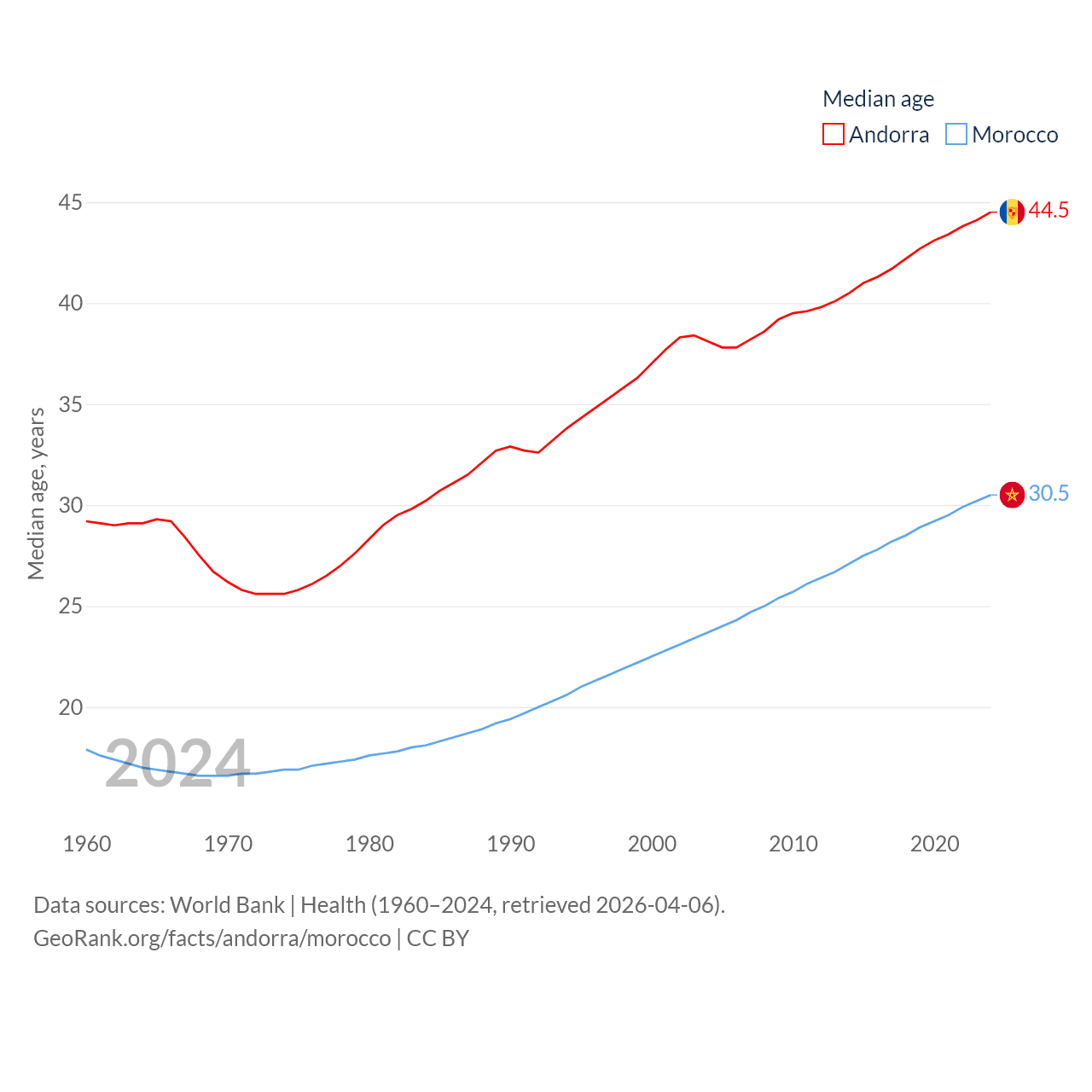 Andorra has a population of 81.9K (ranked 186/197), compared with 38.1M in Morocco (ranked 39/197). Andorra's land area is 181.5 sq mi versus 172,317 sq mi for Morocco (ranked 179th vs. 55th).