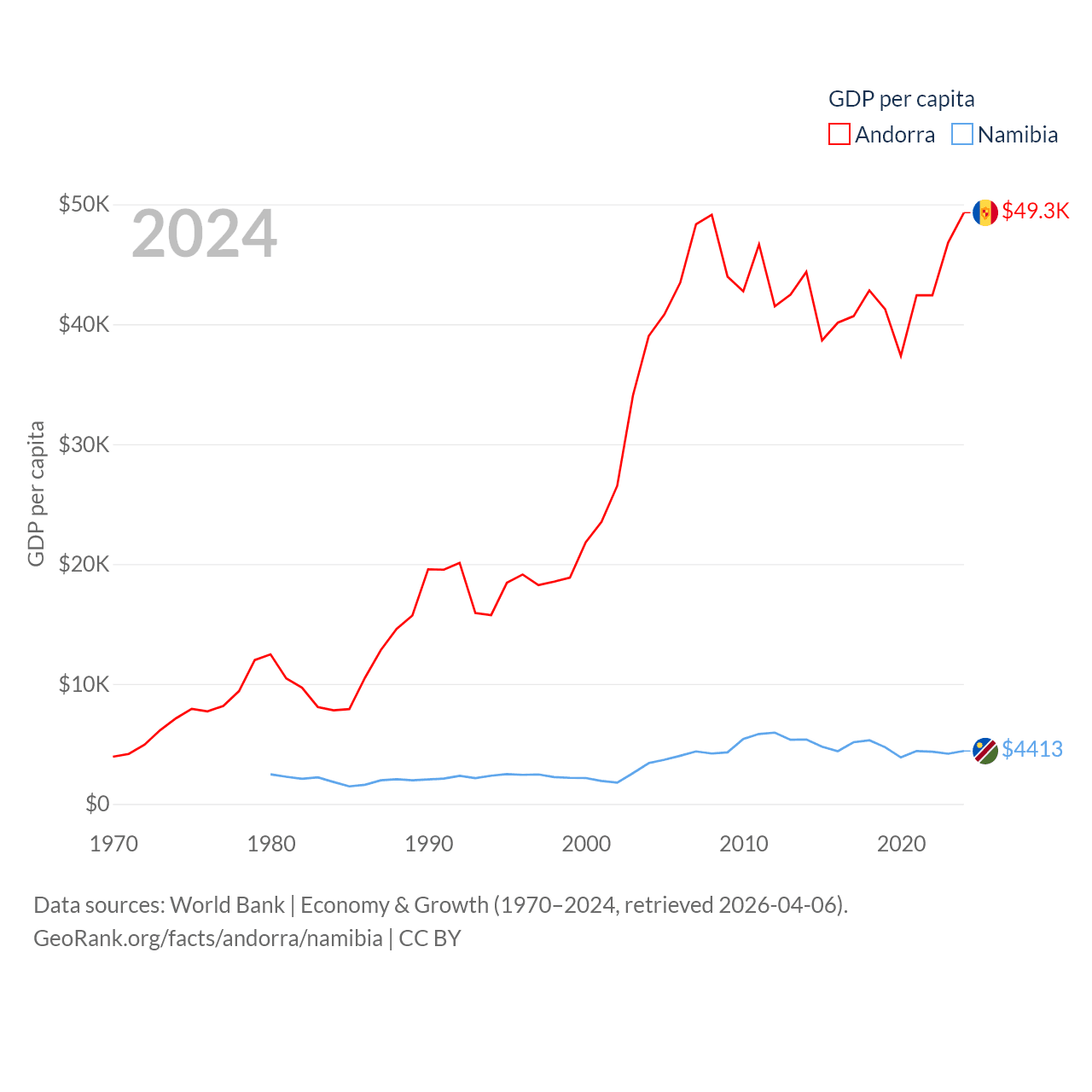 By GDP, Andorra ranks 166/197 ($4.04B) and Namibia ranks 147/197 ($13.4B). By GDP per capita, Andorra ranks 25/197 ($49,304), while Namibia ranks 126/197 ($4,413).