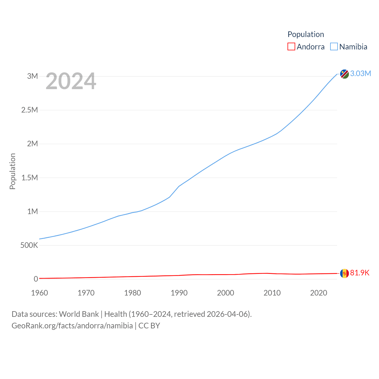 Andorra has a population of 81.9K (ranked 186/197), compared with 3.03M in Namibia (ranked 136/197). Andorra's land area is 181.5 sq mi versus 317,874 sq mi for Namibia (ranked 179th vs. 33rd).