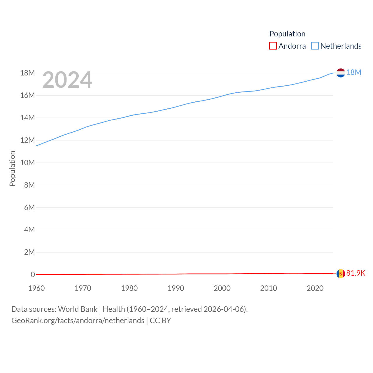 Andorra has a population of 81.9K (ranked 186/197), compared with 18M in The Netherlands (ranked 72/197). Andorra's land area is 181.5 sq mi versus 13,000 sq mi for The Netherlands (ranked 179th vs. 134th).