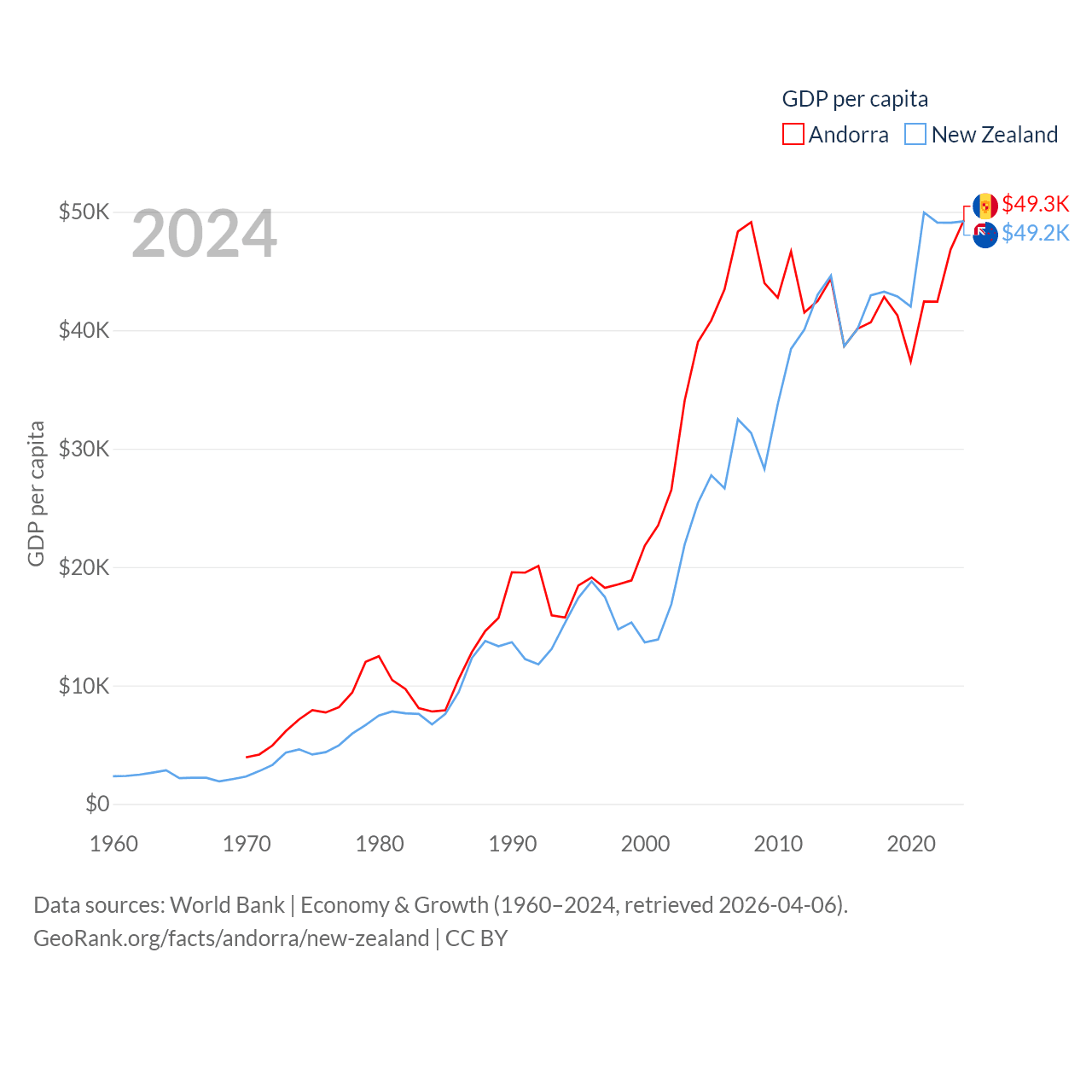 By GDP, Andorra ranks 166/197 ($4.04B) and New Zealand ranks 52/197 ($260B). By GDP per capita, Andorra ranks 25/197 ($49,304), while New Zealand ranks 26/197 ($49,205).