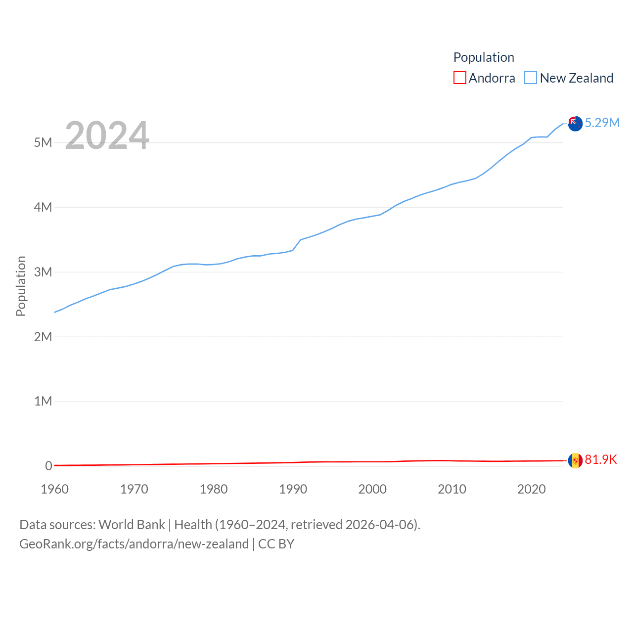 Andorra has a population of 81.9K (ranked 186/197), compared with 5.29M in New Zealand (ranked 123/197). Andorra's land area is 181.5 sq mi versus 101,665 sq mi for New Zealand (ranked 179th vs. 74th).