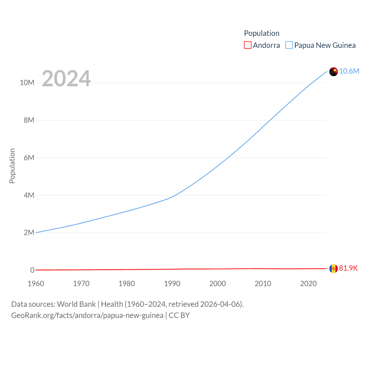 Andorra has a population of 81.9K (ranked 186/197), compared with 10.6M in Papua New Guinea (ranked 92/197). Andorra's land area is 181.5 sq mi versus 174,850 sq mi for Papua New Guinea (ranked 179th vs. 54th).