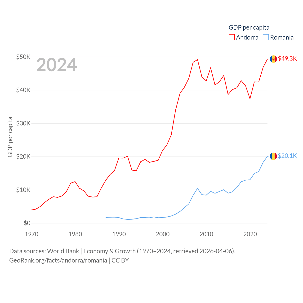 By GDP, Andorra ranks 166/197 ($4.04B) and Romania ranks 42/197 ($383B). By GDP per capita, Andorra ranks 25/197 ($49,304), while Romania ranks 58/197 ($20,080).