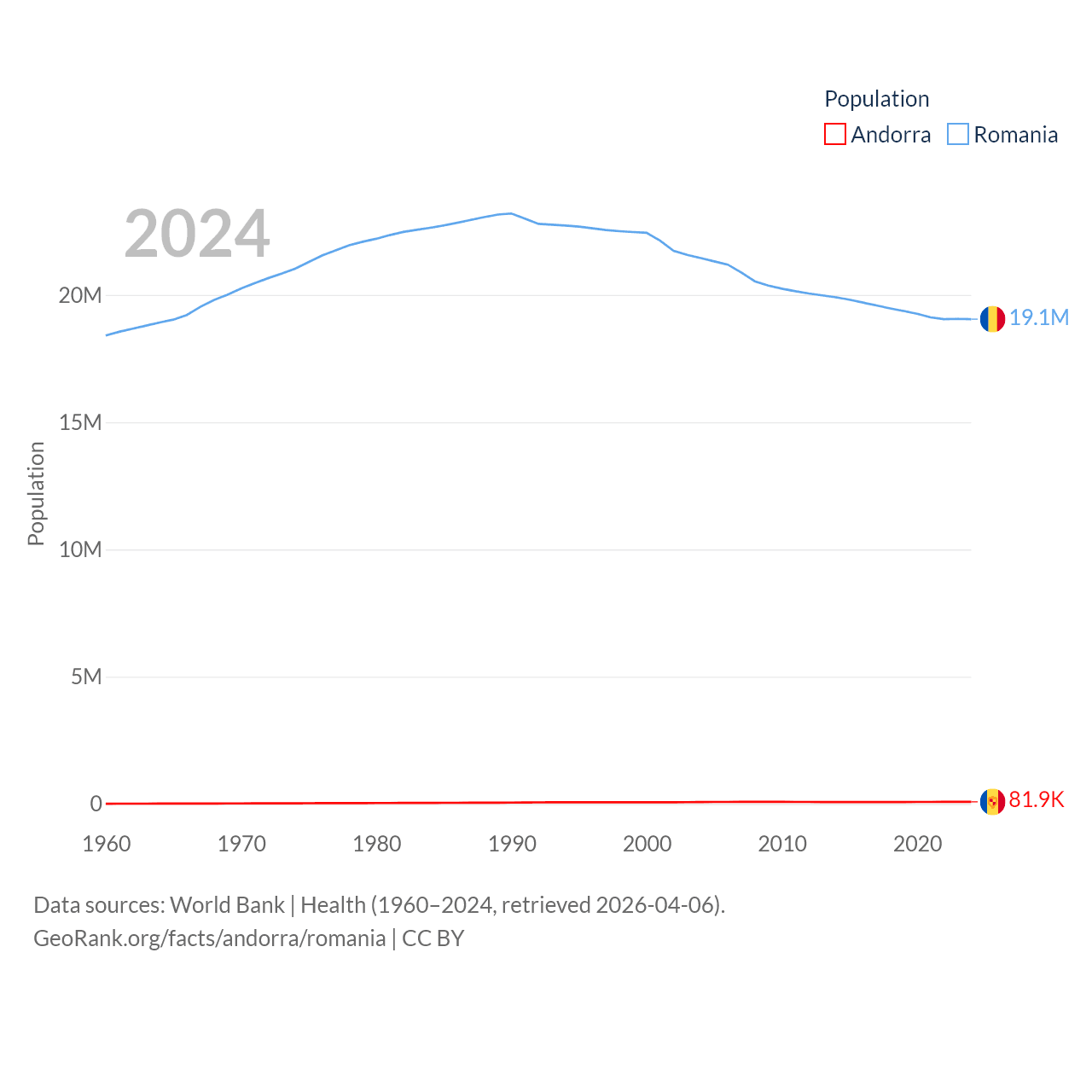 Andorra has a population of 81.9K (ranked 186/197), compared with 19.1M in Romania (ranked 67/197). Andorra's land area is 181.5 sq mi versus 88,834 sq mi for Romania (ranked 179th vs. 80th).