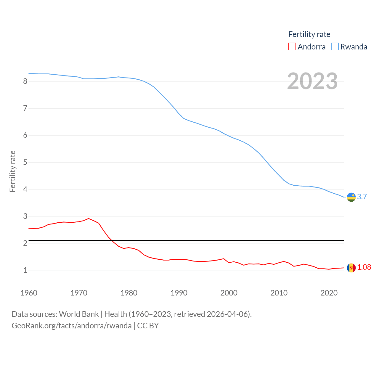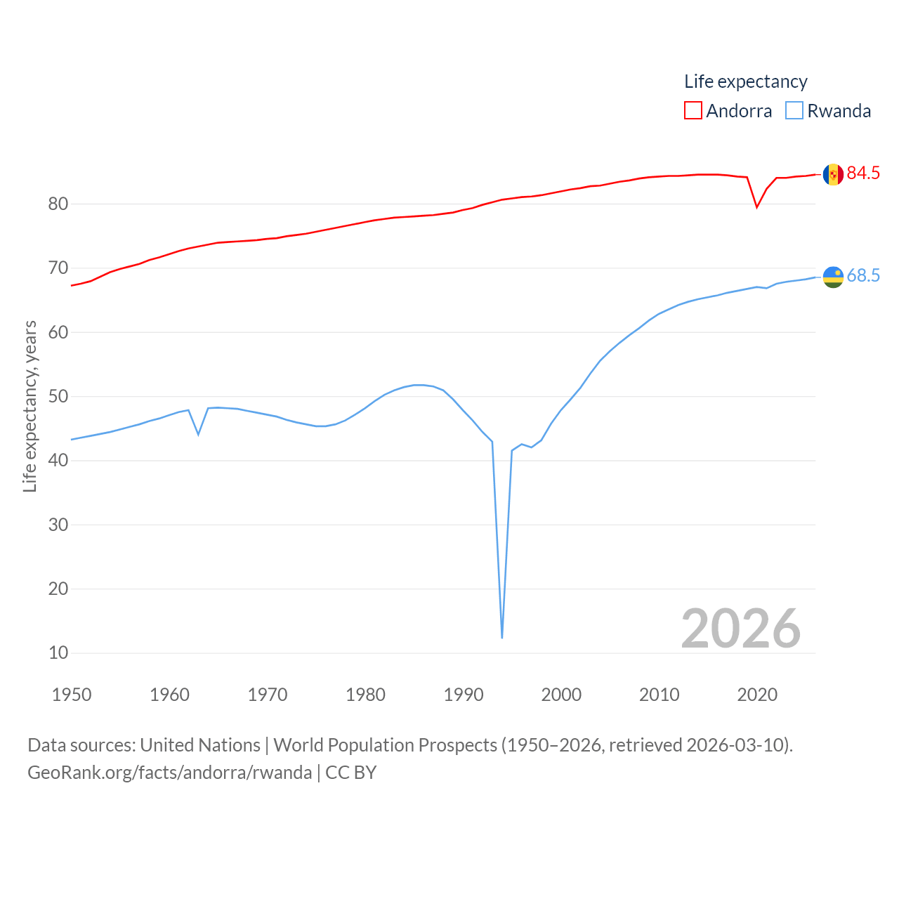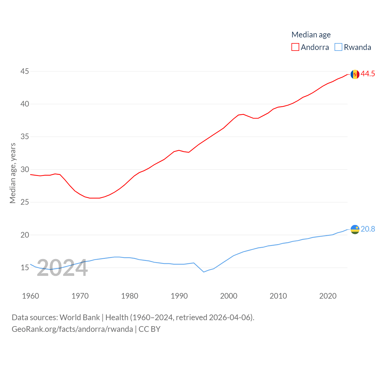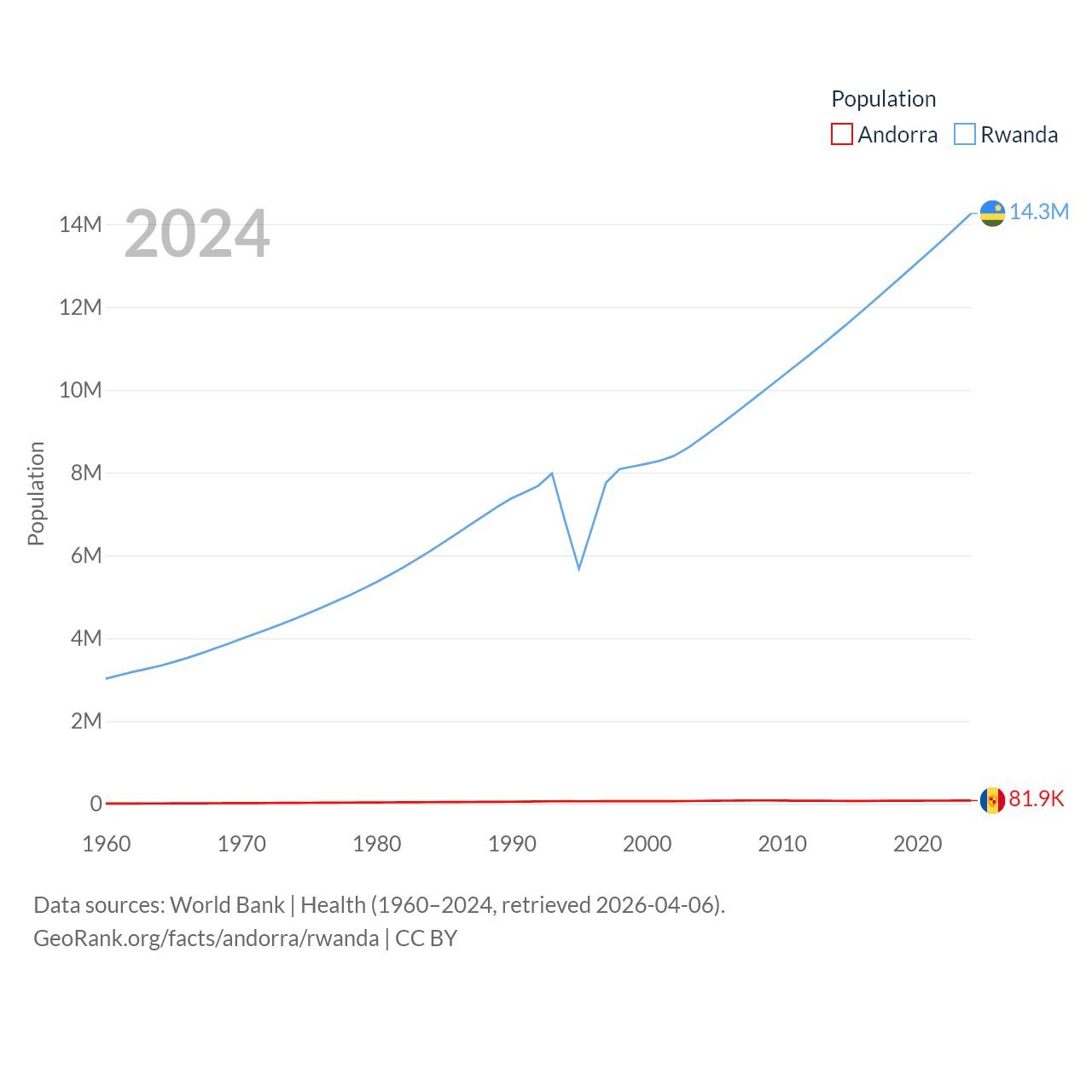 Andorra has a population of 81.9K (ranked 186/197), compared with 14.3M in Rwanda (ranked 77/197). Andorra's land area is 181.5 sq mi versus 9,525 sq mi for Rwanda (ranked 179th vs. 146th).