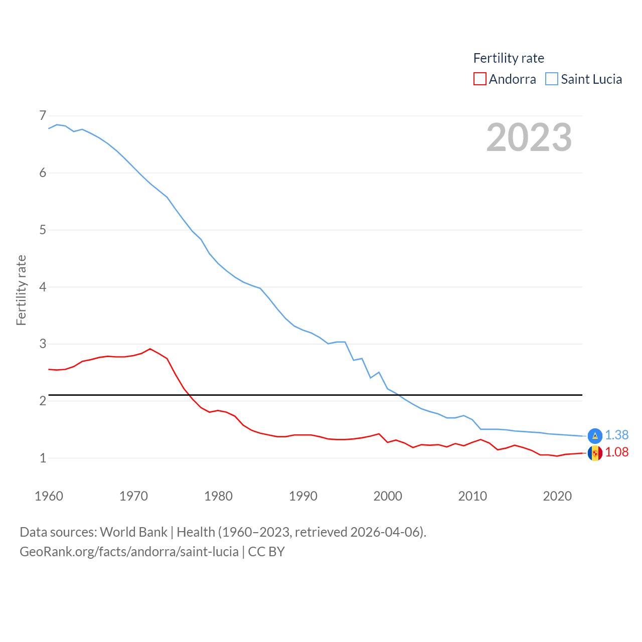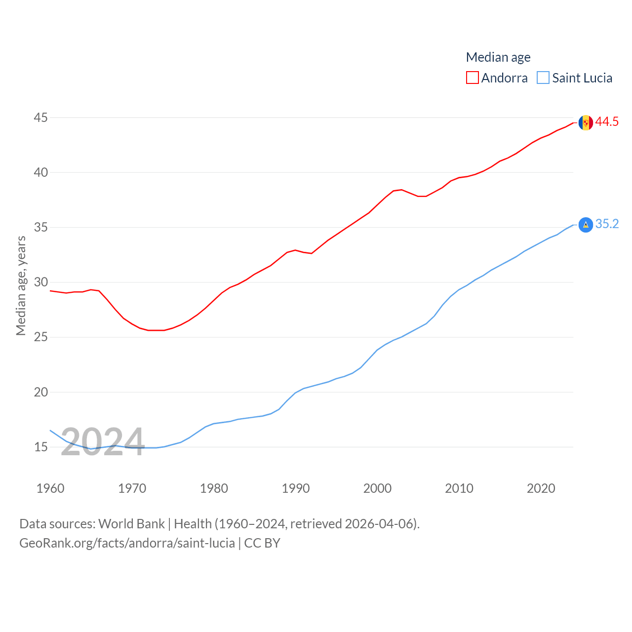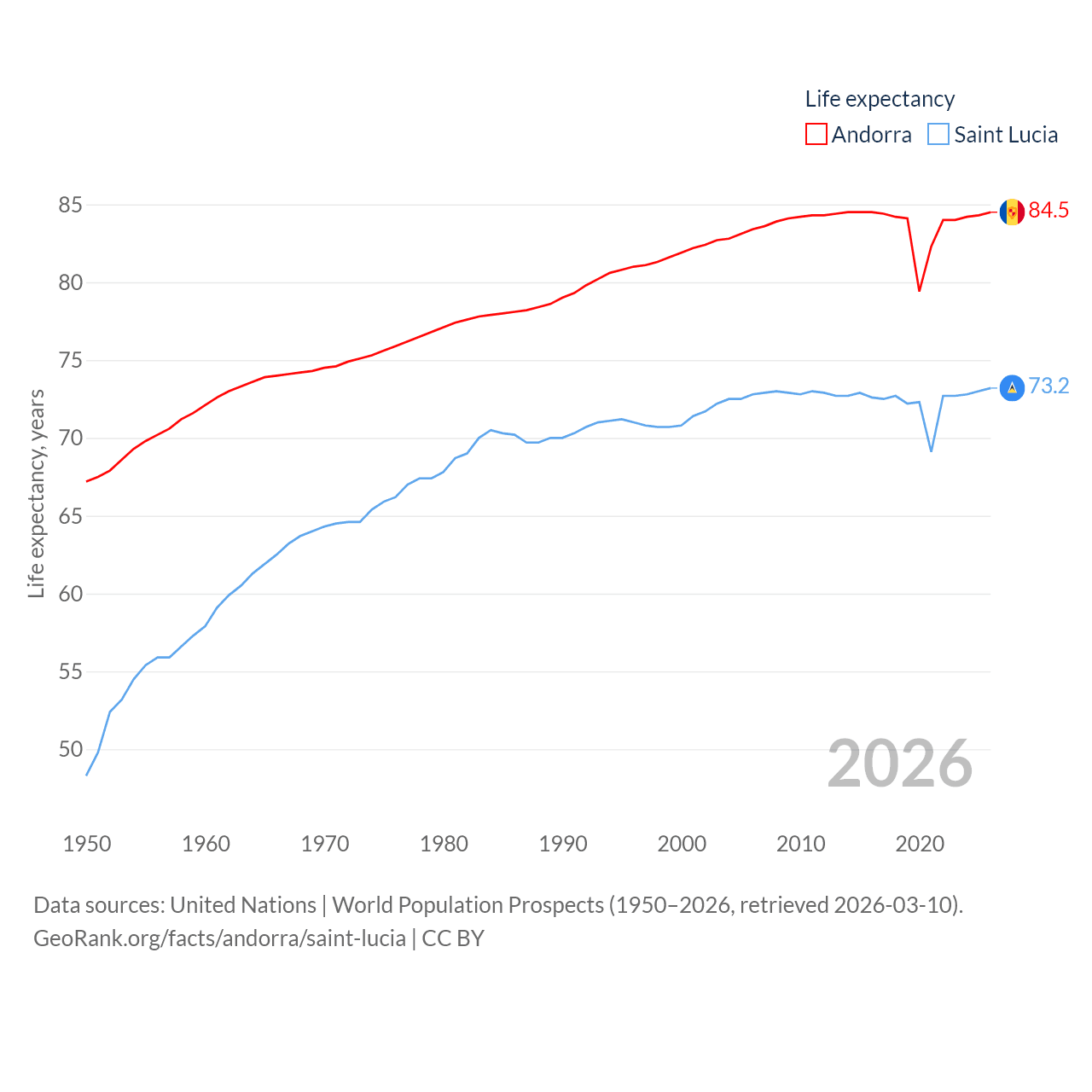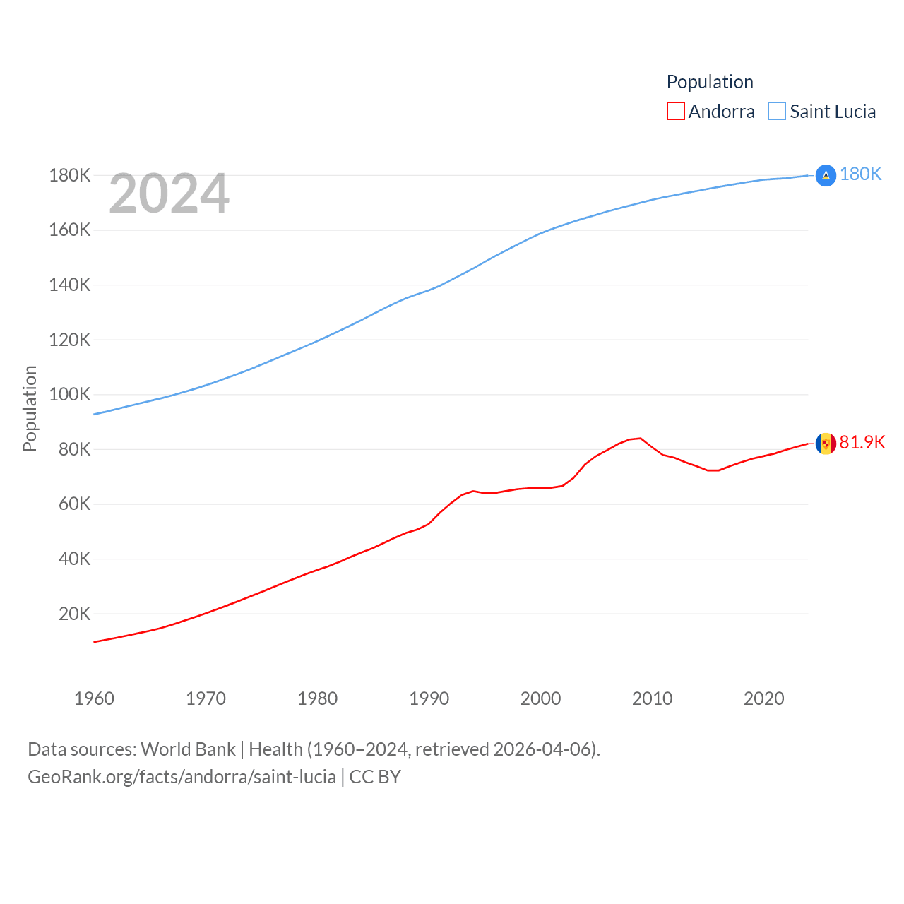 Andorra has a population of 81.9K (ranked 186/197), compared with 180K in Saint Lucia (ranked 178/197). Andorra's land area is 181.5 sq mi versus 235.5 sq mi for Saint Lucia (ranked 179th vs. 178th).