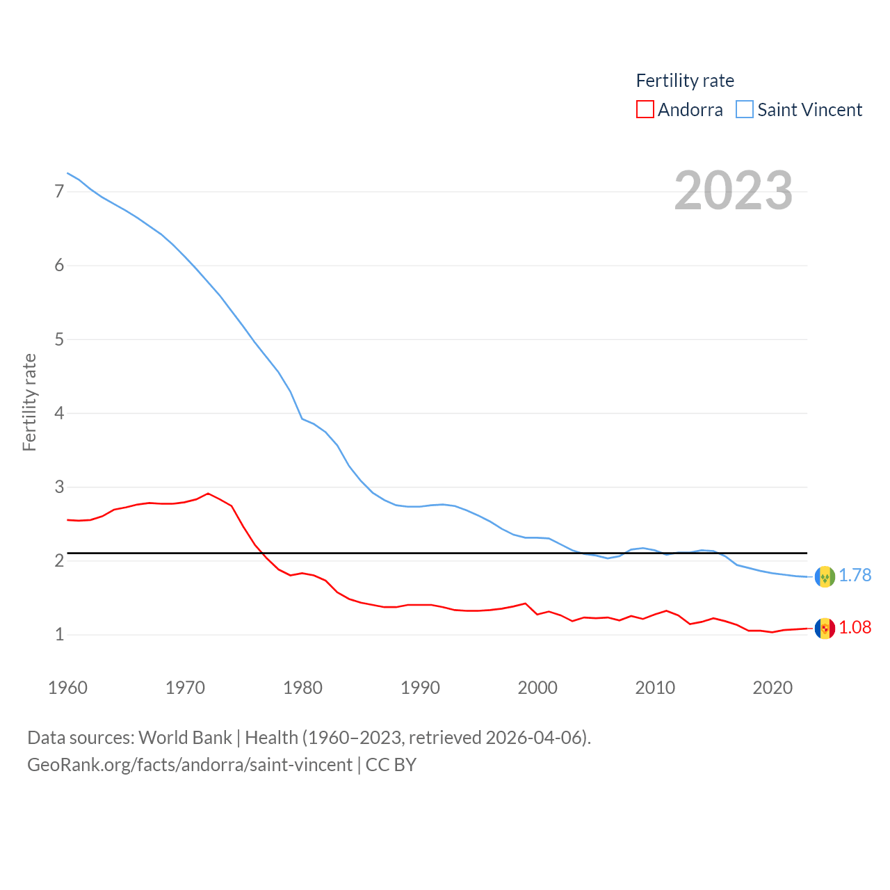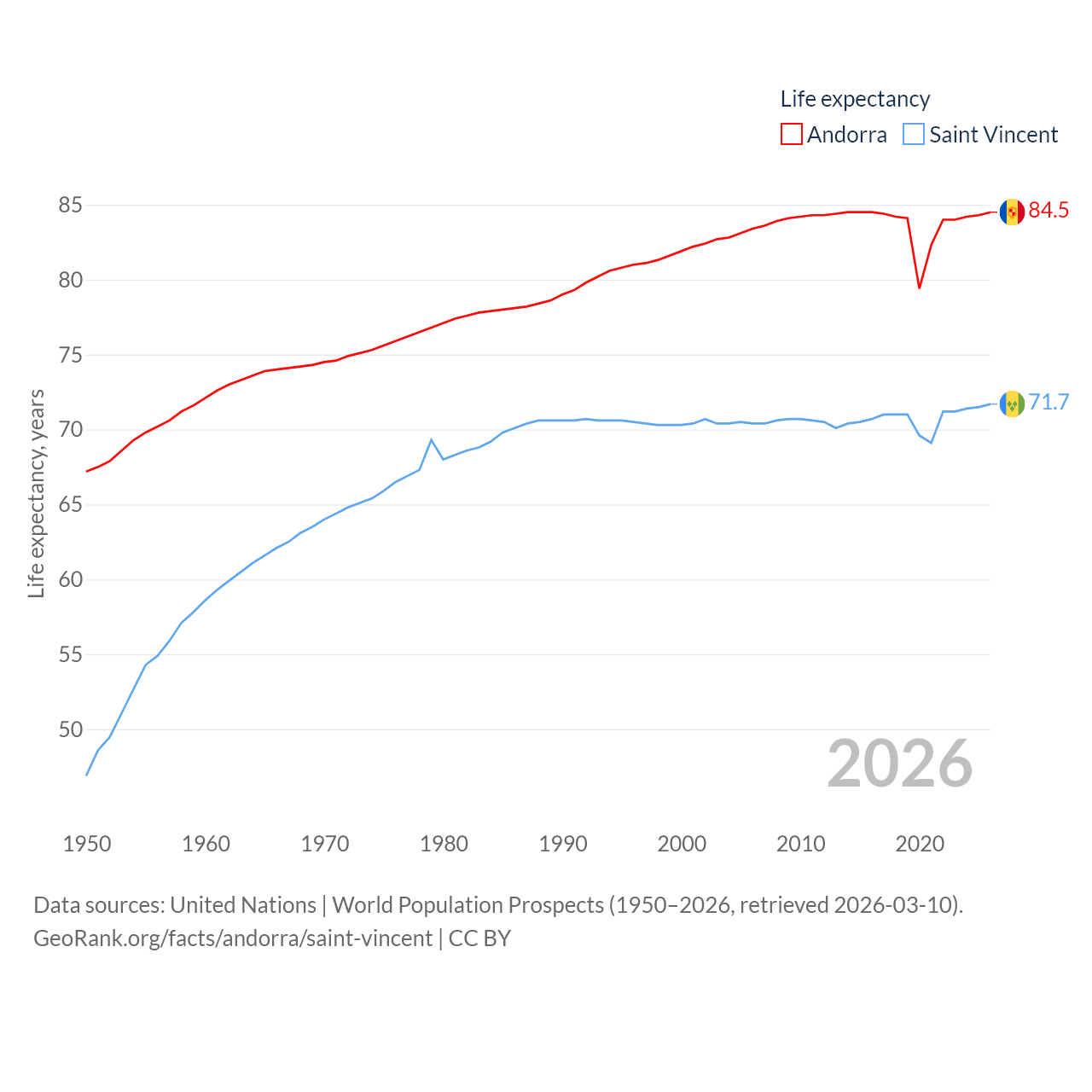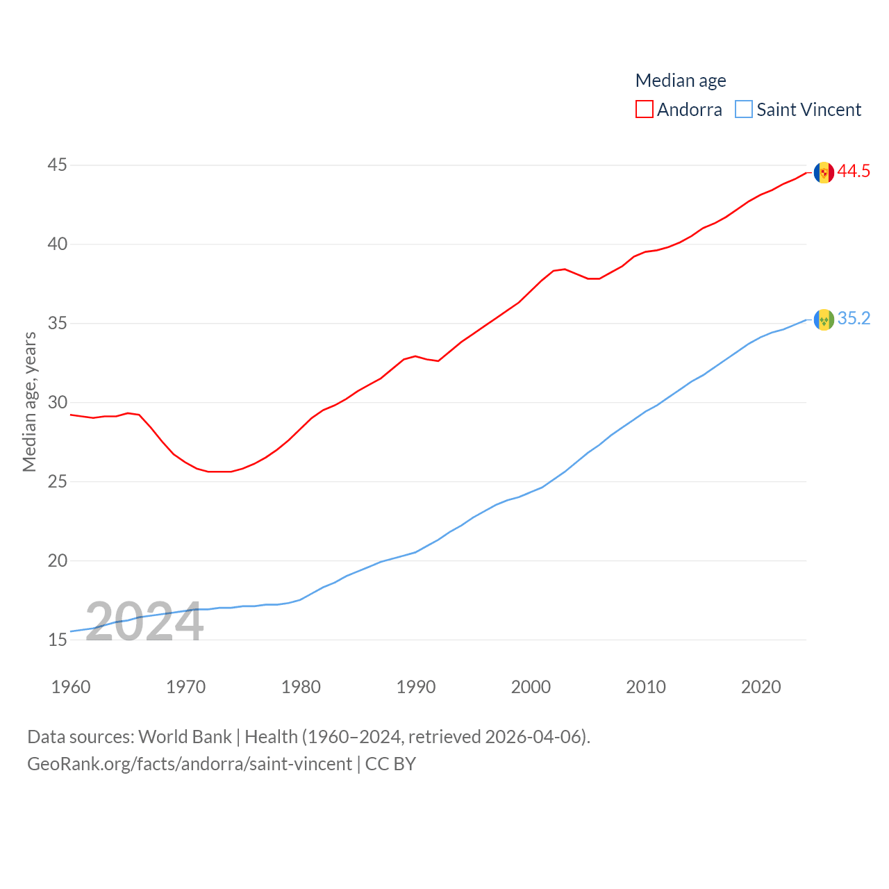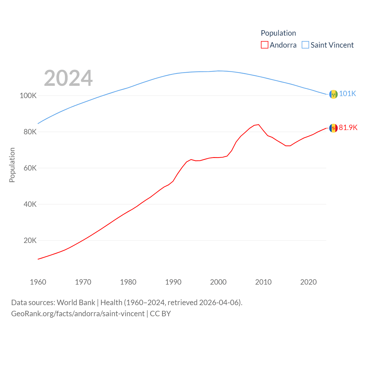 Andorra has a population of 81.9K (ranked 186/197), compared with 101K in Saint Vincent (ranked 184/197). Andorra's land area is 181.5 sq mi versus 150.6 sq mi for Saint Vincent (ranked 179th vs. 185th).